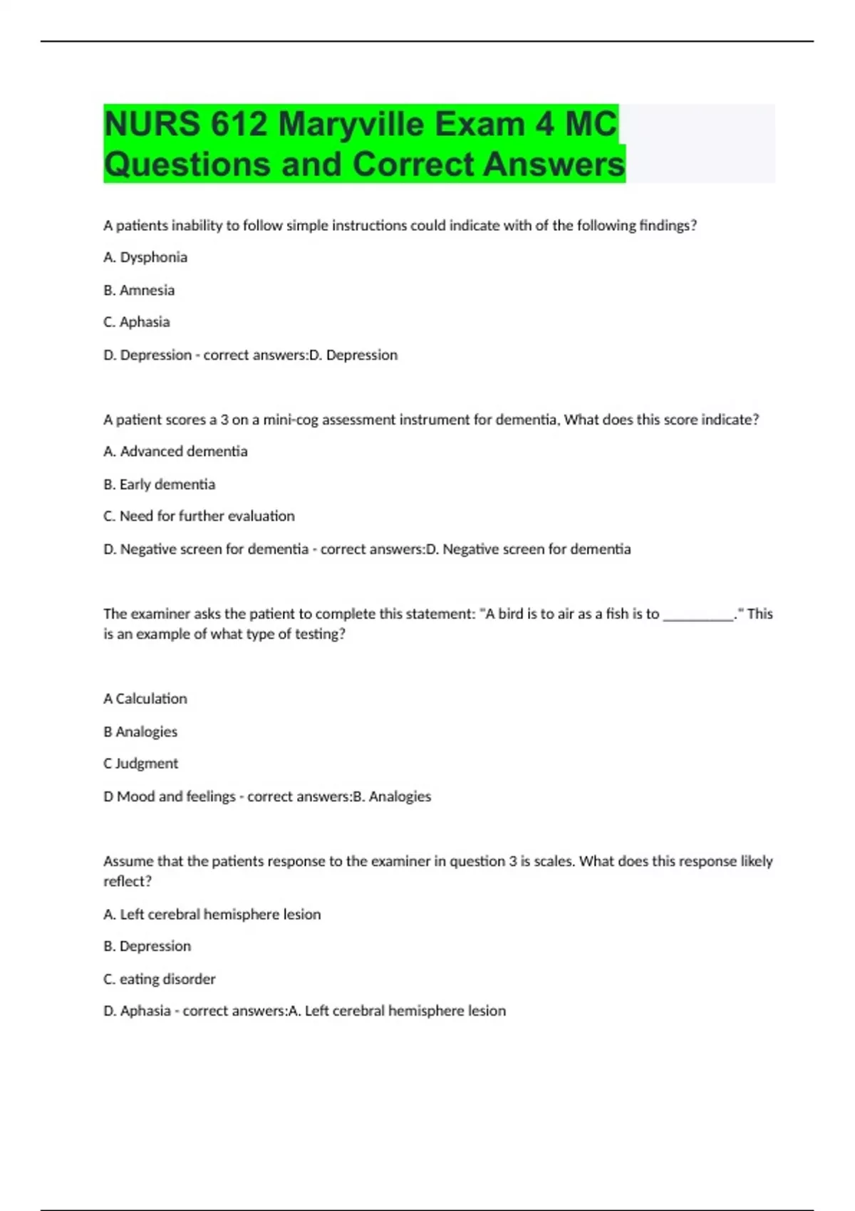 D. Negative screen for dementia - correct answers:D. Negative screen for dementia