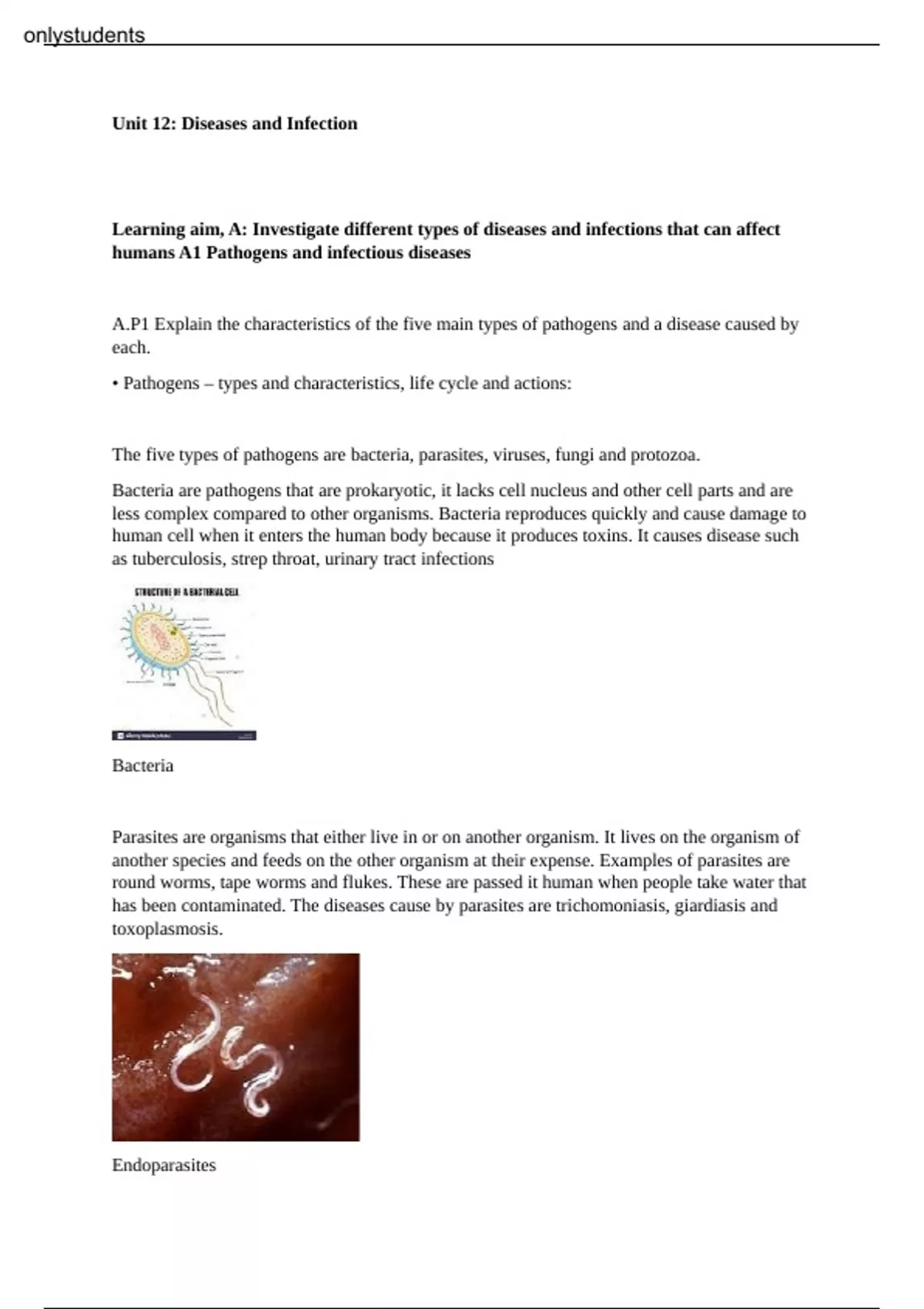 Unit 12: Diseases and InfectionLearning aim, A: Investigate different types of diseases and infections that can affect humans A1 Pathogens and infectious diseases A.P1 Explain the characteristics of the five main types of pathogens and a disease caused by each. • Pathogens – types and characteristics, life cycle and actions: The five types of pathogens are bacteria, parasites, viruses, fungi and protozoa. Bacteria are pathogens that are prokaryotic, it lacks cell nucleus and other cell parts and are less complex compared to other organisms. Bacteria reproduces quickly and cause damage to human cell when it enters the human body because it produces toxins. It causes disease such as tuberculosis, strep throat, urinary tract infections Bacteria Parasites are organisms that either live in or on another organism. It lives on the organism of another species and feeds on the other organism at their expense. Examples of parasites are round worms, tape worms and flukes. These are passed it human when people take water that has been contaminated. The diseases cause by parasites are trichomoniasis, giardiasis and toxoplasmosis. Endoparasites