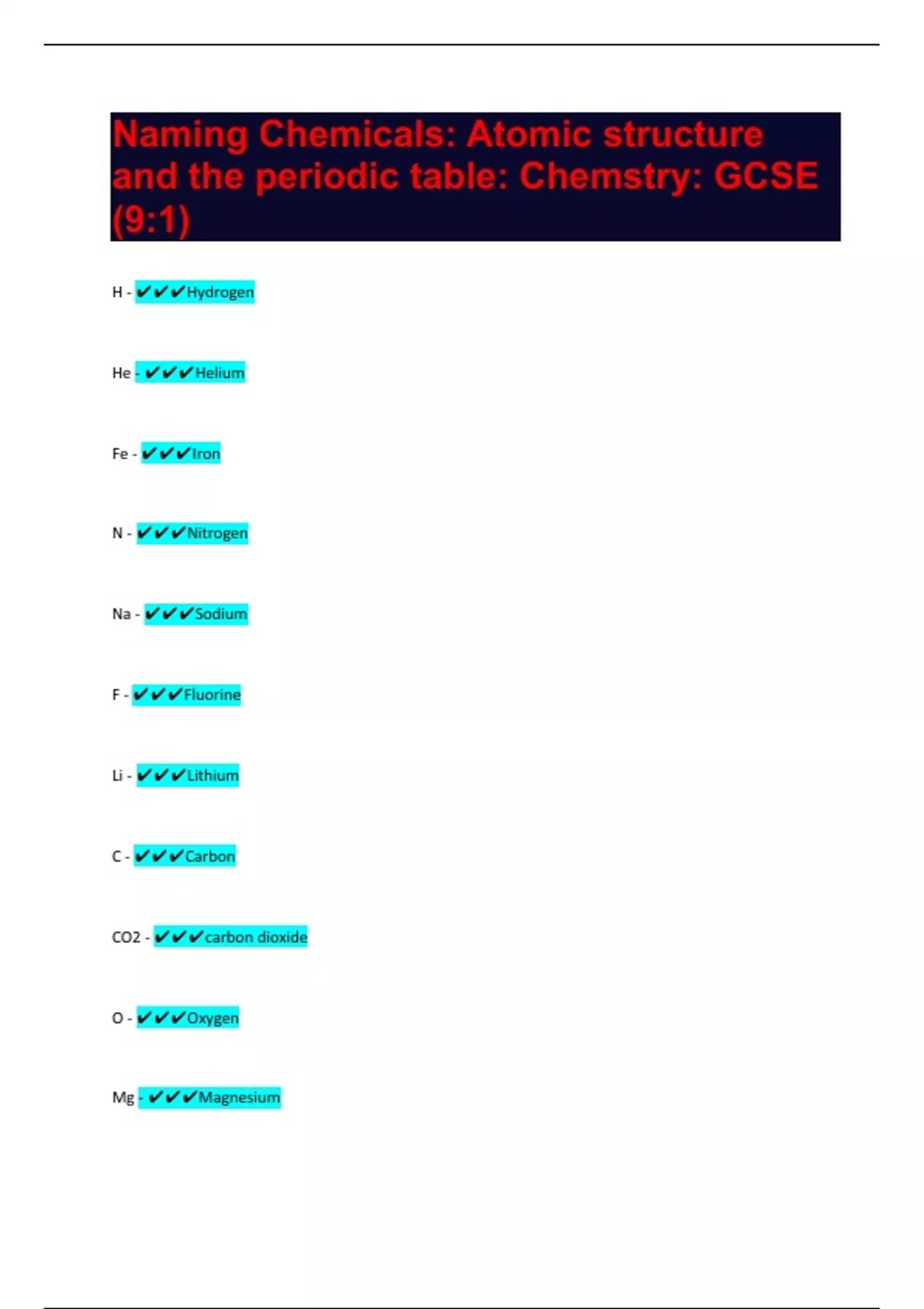 H - Hydrogen He - Helium Fe - Iron N - Nitrogen Na - Sodium F - Fluorine Li - Lithium C - Carbon CO2 - carbon dioxide