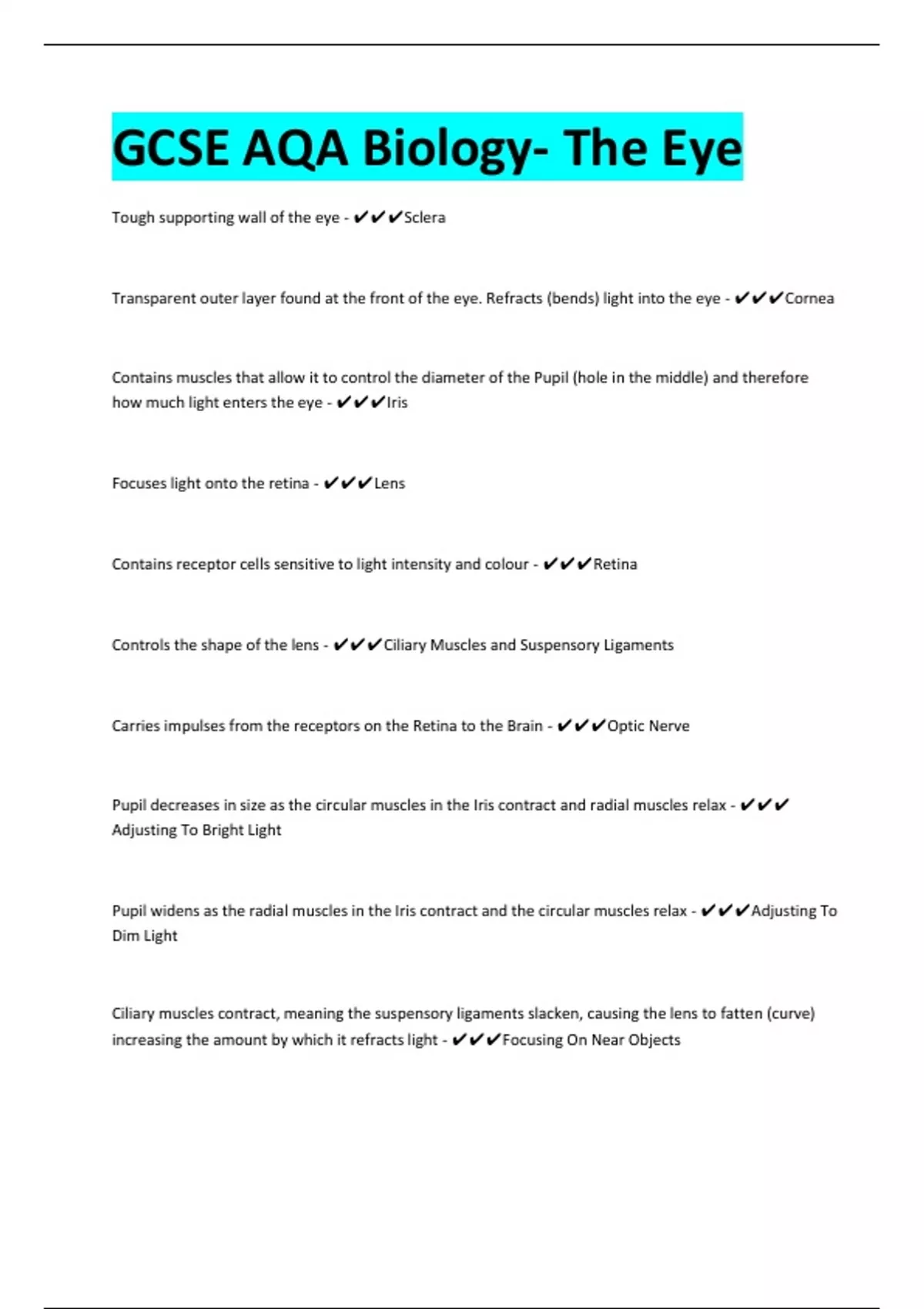 Focuses light onto the retina - ✔✔✔Lens
