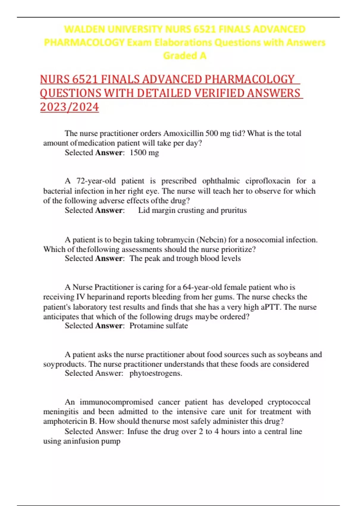 NURS 6521 FINALS ADVANCED PHARMACOLOGY QUESTIONS WITH DETAILED VERIFIED ANSWERS 2023/2024 The nurse practitioner orders Amoxicillin 500 mg tid? What is the total amount ofmedication patient will take per day? Selected Answer: 1500 mg A 72-year-old patient is prescribed ophthalmic ciprofloxacin for a bacterial infection in her right eye. The nurse will teach her to observe for which of the following adverse effects ofthe drug? Selected Answer: Lid margin crusting and pruritus A patient is to begin taking tobramycin (Nebcin) for a nosocomial infection. Which of thefollowing assessments should the nurse prioritize? Selected Answer: The peak and trough blood levels A Nurse Practitioner is caring for a 64-year-old female patient who is receiving IV heparinand reports bleeding from her gums. The nurse checks the patient's laboratory test results and finds that she has a very high aPTT. The nurse anticipates that which of the following drugs maybe ordered? Selected Answer: Protamine sulfate A patient asks the nurse practitioner about food sources such as soybeans and soyproducts. The nurse practitioner understands that these foods are considered Selected Answer: phytoestrogens. An immunocompromised cancer patient has developed cryptococcal meningitis and been admitted to the intensive care unit for treatment with amphotericin B. How should thenurse most safely administer this drug? Selected Answer: Infuse the drug over 2 to 4 hours into a central line using aninfusion pum