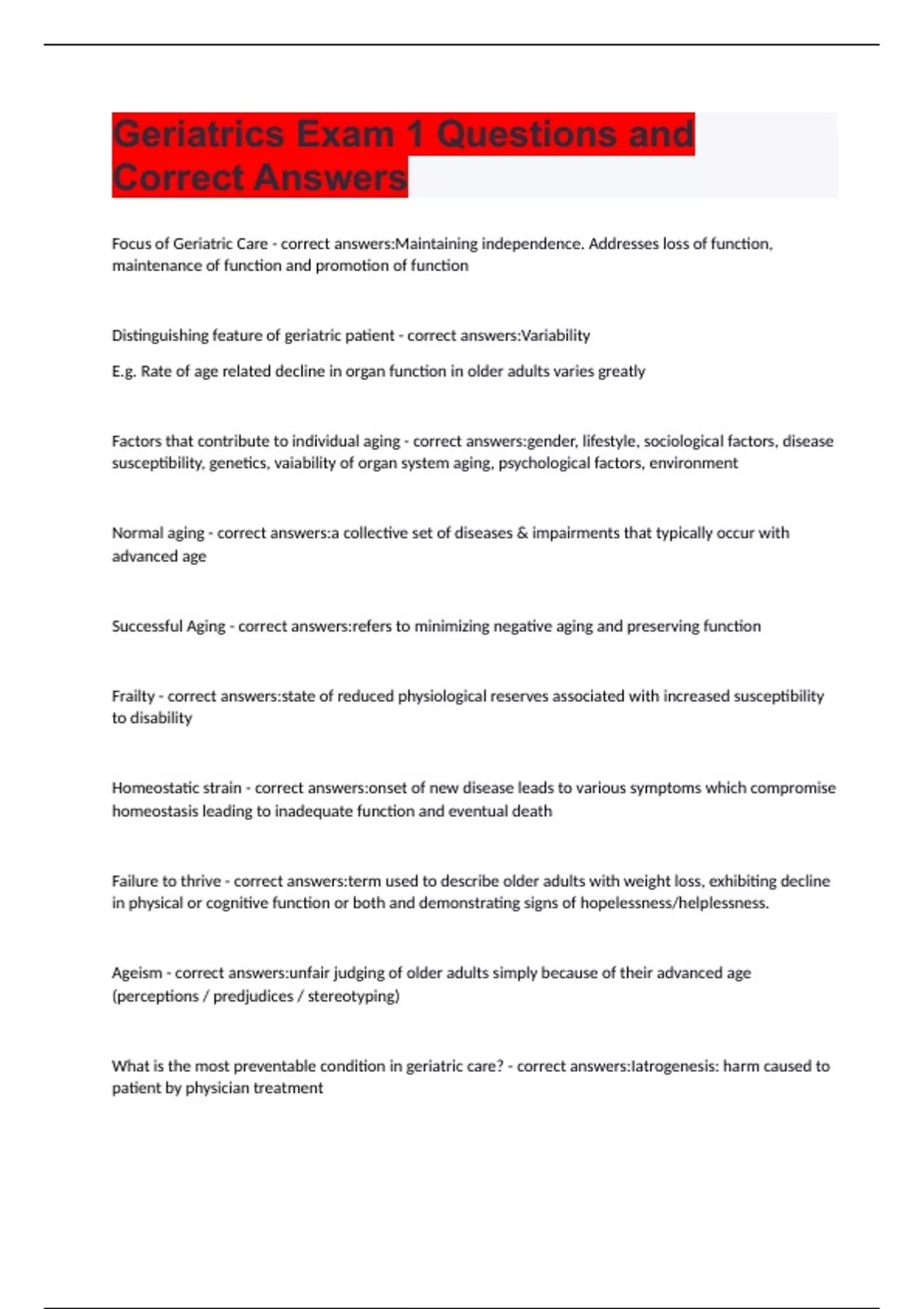 Geriatrics Exam 1 Questions and