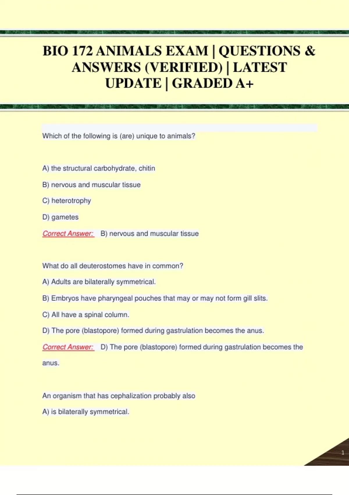 BIO 172 ANIMALS EXAM | QUESTIONS & ANSWERS (VERIFIED) | LATEST UPDATE | GRADED A+
