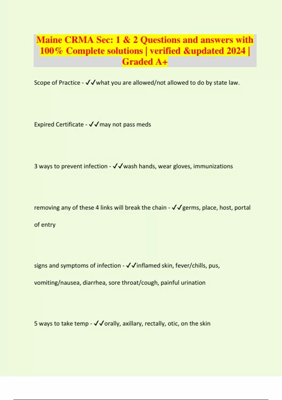 Maine CRMA Sec: 1 & 2 Questions and answers with 100% Complete solutions | verified &updated 2024 | Graded A+ Scope of Practice - what you are allowed/not allowed to do by state law. Expired Certificate - may not pass meds 3 ways to prevent infection - wash hands, wear gloves, immunizations removing any of these 4 links will break the chain - germs, place, host, portal of entry signs and symptoms of infection - inflamed skin, fever/chills, pus, vomiting/nausea, diarrhea, sore throat/cough, painful urination 5 ways to take temp - orally, axillary, rectally, otic, on the skin most accurate way to take temp - rectal 5 vital signs that alert us to change are - temp (t), blood pressure (bp), pulse (p), respiration (r), oxygen (02) Radial pulse - 60-100 bpm, average 80 Respirations - 12-20 per minute What is needed to take vital signs: - A bp cuff, stethoscope, thermometer, Timer