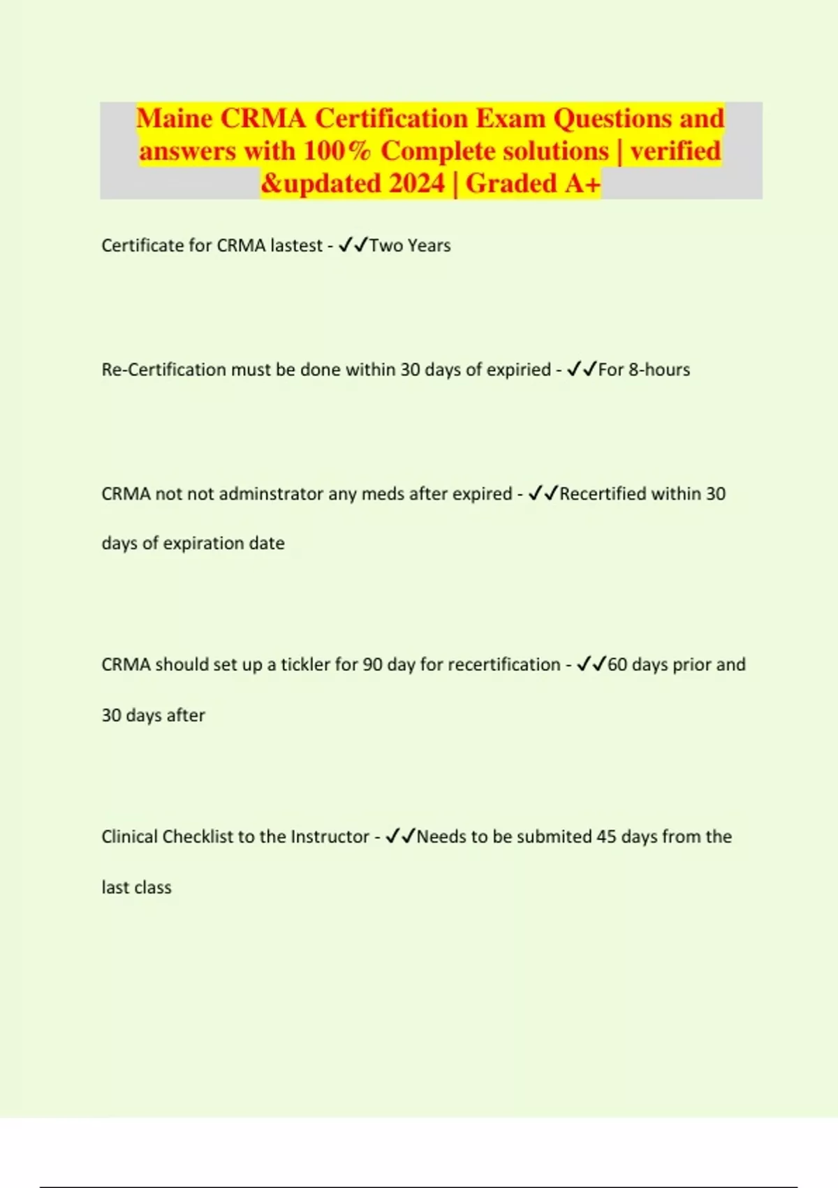 Maine CRMA Certification Exam Questions and answers with 100% Complete solutions | verified &updated 2024 | Graded A+ Certificate for CRMA lastest - Two Years Re-Certification must be done within 30 days of expiried - For 8-hours CRMA not not adminstrator any meds after expired - Recertified within 30 days of expiration date CRMA should set up a tickler for 90 day for recertification - 60 days prior and 30 days after Clinical Checklist to the Instructor - Needs to be submited 45 days from the last class Instructor has to submit the checklist & validation form to Dept - 60 days from the last day of class The tasks a CRMA is expected & allowed to do as part of the job - "Scope of Practice Adminstrator - Deceision making, approves changes in systems or procedures, problem solving (Medication Errors, Incident Reports, Mediction Refusals and Safe Practices