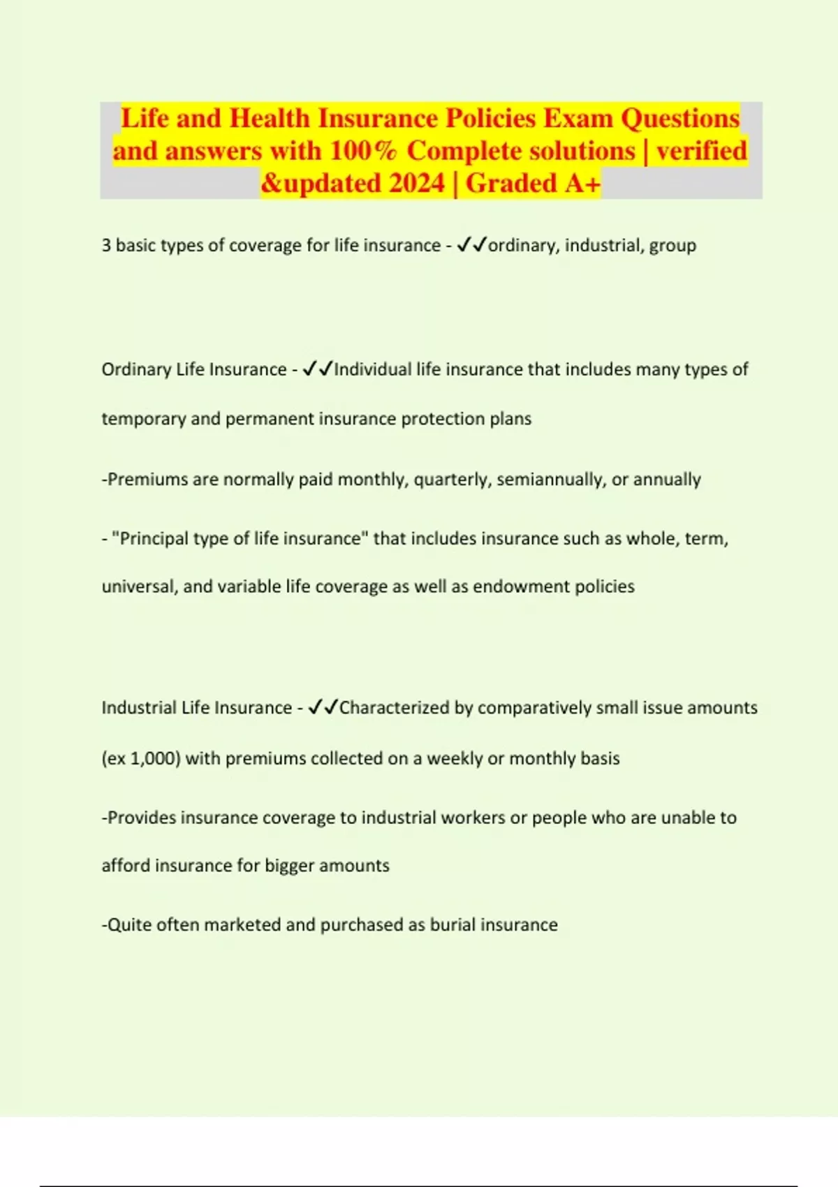Life and Health Insurance Policies Exam Questions and answers with 100% Complete solutions | verified &updated 2024 | Graded A+ 3 basic types of coverage for life insurance - ordinary, industrial, group Ordinary Life Insurance - Individual life insurance that includes many types of temporary and permanent insurance protection plans -Premiums are normally paid monthly, quarterly, semiannually, or annually - "Principal type of life insurance" that includes insurance such as whole, term, universal, and variable life coverage as well as endowment policies Industrial Life Insurance - Characterized by comparatively small issue amounts (ex 1,000) with premiums collected on a weekly or monthly basis -Provides insurance coverage to industrial workers or people who are unable to afford insurance for bigger amounts -Quite often marketed and purchased as burial insurance Group Insurance - Is written for employer, employee groups, associations, unions, and creditors to provider coverage for a number of individuals under one contract -Underwriting based on the group not the indivual Term Life Insurance - Provides low-cost insurance protection for a specified period (term) and pays a benefit only if the insured dies during that period -NO CASH VALUE -Bought $50k 20yr plan Dies before 20yrs ==>gets $50k Dies after 20yrs ==>gets nothing -Term life provides the greatest amount of death benefit per dollar of initial cash outlay 3 Basic Forms of Term Life - Level term Decreasing term Increasing term