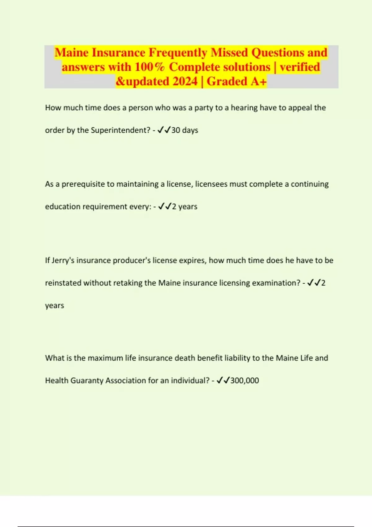 Maine Insurance Frequently Missed Questions and answers with 100% Complete solutions | verified &updated 2024 | Graded A+ How much time does a person who was a party to a hearing have to appeal the order by the Superintendent? - 30 days As a prerequisite to maintaining a license, licensees must complete a continuing education requirement every: - 2 years If Jerry's insurance producer's license expires, how much time does he have to be reinstated without retaking the Maine insurance licensing examination? - 2 years What is the maximum life insurance death benefit liability to the Maine Life and Health Guaranty Association for an individual? - 300,000 If an insurance producer, changes their business address, how much time does she have to inform the Superintendent? - 30 days What is the maximum prison sentence for someone who continues to be involved in the insurance business after their insurance producer license has been suspended? - 6 months How much time does an insurance licensee have to apply a received premium? - 30 days What