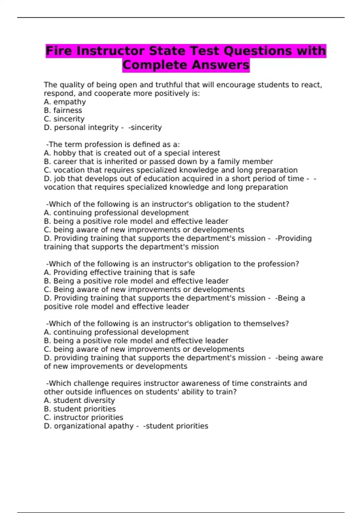 Fire Instructor State Test Questions with