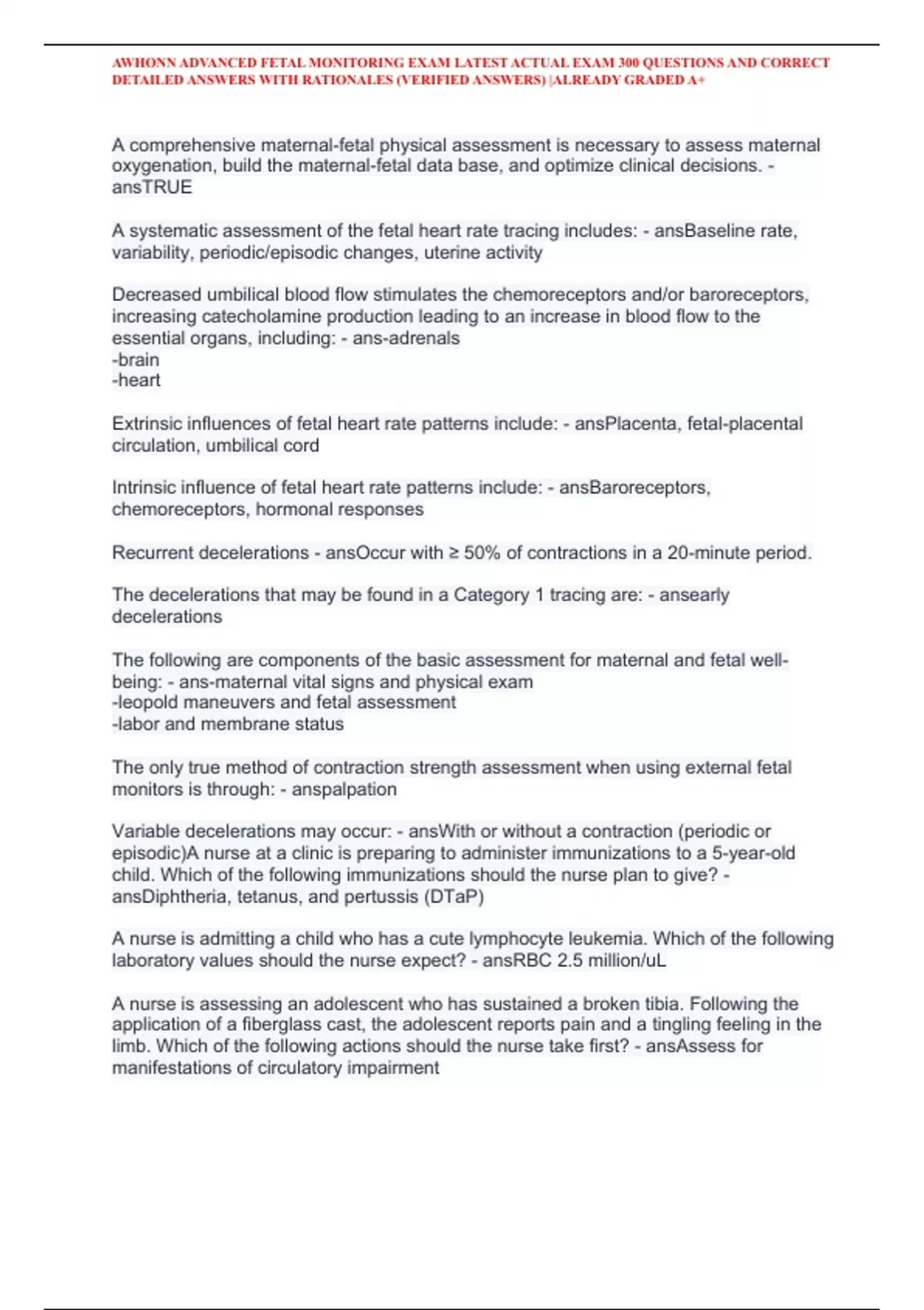 AWHONN ADVANCED FETAL MONITORING EXAM LATEST ACTUAL EXAM 300 QUESTIONS AND CORRECT DETAILED ANSWERS WITH RATIONALES (VERIFIED ANSWERS) |ALREADY GRADED A+