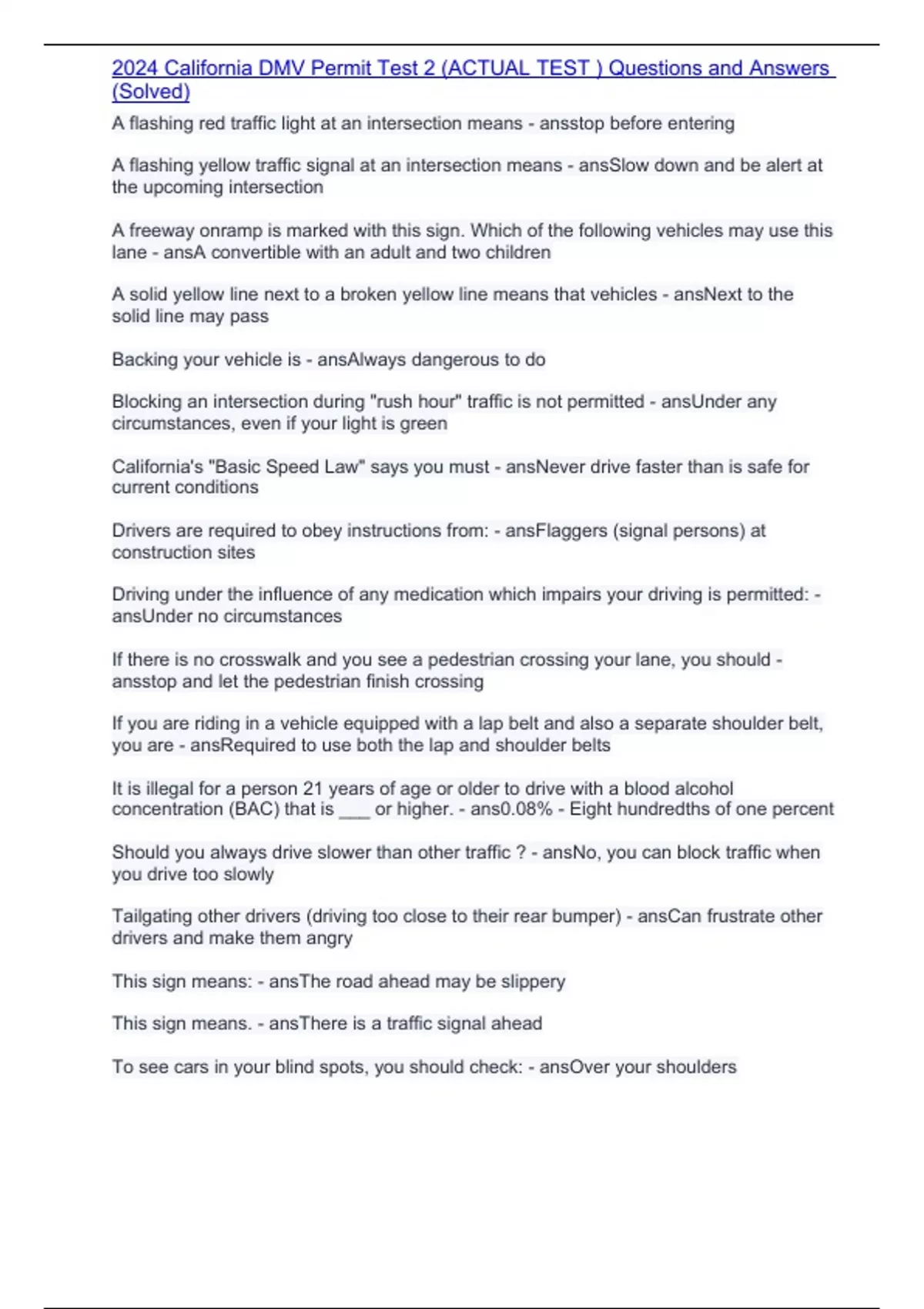,2024 California DMV Permit Test 2 (ACTUAL TEST ) Questions and Answers