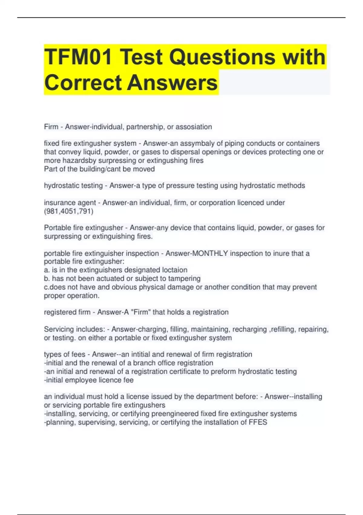 TFM01 Test Questions with Correct Answers Firm - Answer-individual, partnership, or assosiation fixed fire extingusher system - Answer-an assymbaly of piping conducts or containers that convey liquid, powder, or gases to dispersal openings or devices protecting one or more hazardsby surpressing or extingushing fires Part of the building/cant be moved hydrostatic testing - Answer-a type of pressure testing using hydrostatic methods insurance agent - Answer-an individual, firm, or corporation licenced under (981,4051,791) Portable fire extingusher - Answer-any device that contains liquid, powder, or gases for surpressing or extinguishing fires. portable fire extinguisher inspection - Answer-MONTHLY inspection to inure that a portable fire extingusher: a. is in the extinguishers designated loctaion b. has not been actuated or subject to tampering not have and obvious physical damage or another condition that may prevent proper operation. registered firm - Answer-A "Firm" that holds a registration Servicing includes: - Answer-charging, filling, maintaining, recharging ,refilling, repairing, or testing. on either a portable or fixed extingusher system types of fees - Answer--an intitial and renewal of firm registration -initial and the renewal of a branch office registration -an initial and renewal of a registration certificate to preform hydrostatic testing -initial employee licence fee