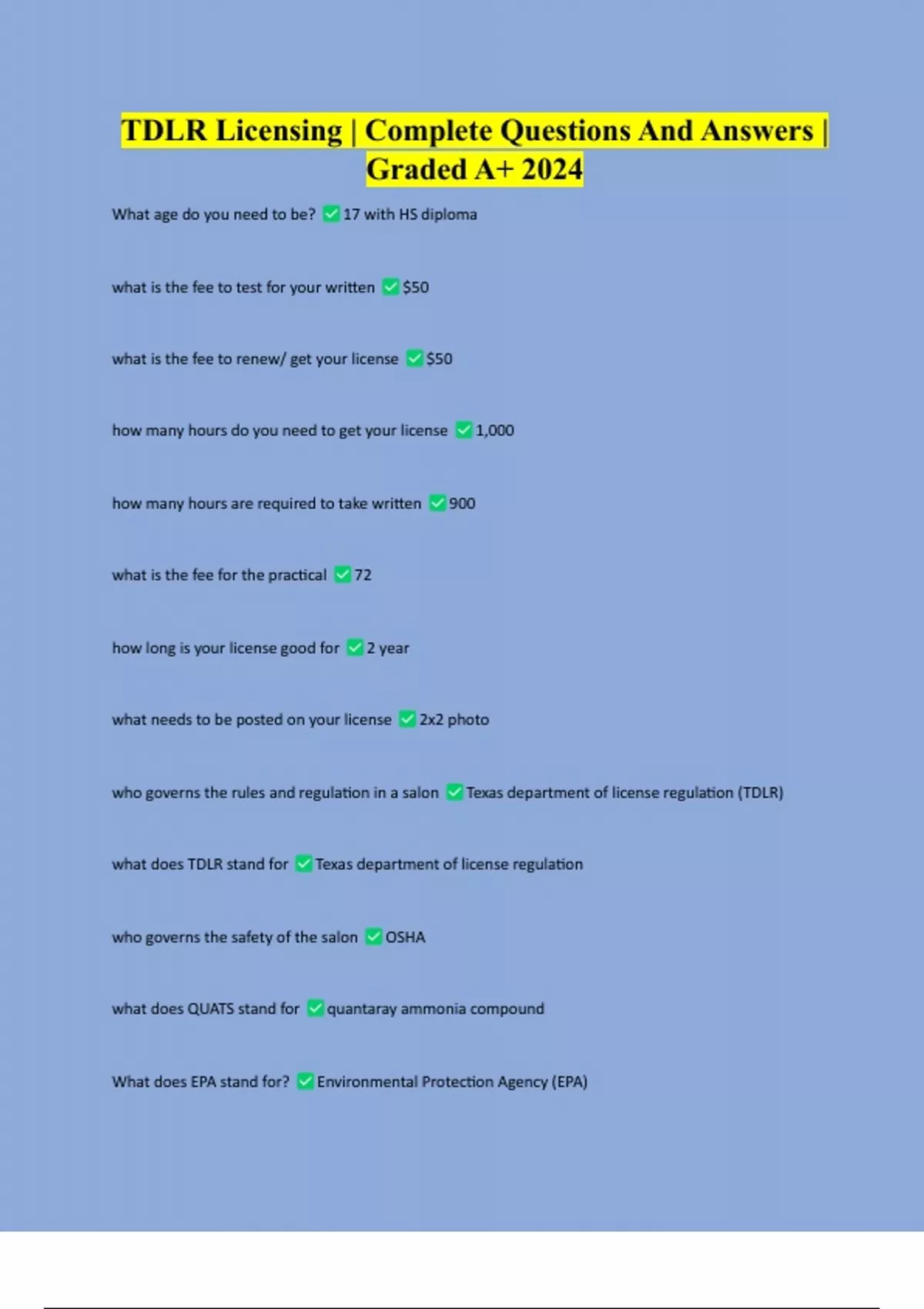 TDLR Licensing | Complete Questions And Answers | Graded A+ 2024 TDLR Licensing | Complete Questions And Answers | Graded A+ 2024