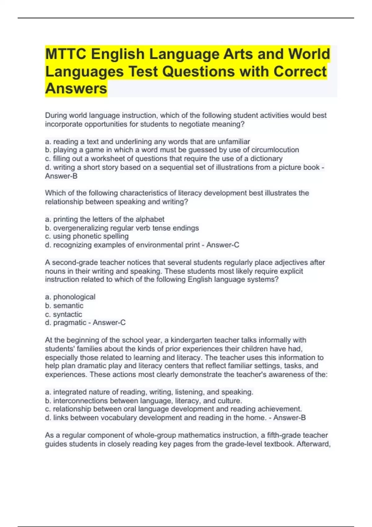 During world language instruction, which of the following student activities would best incorporate opportunities for students to negotiate meaning? a. reading a text and underlining any words that are unfamiliar b. playing a game in which a word must be guessed by use of circumlocution c. filling out a worksheet of questions that require the use of a dictionary d. writing a short story based on a sequential set of illustrations from a picture book - Answer-B Which of the following characteristics of literacy development best illustrates the relationship between speaking and writing? a. printing the letters of the alphabet b. overgeneralizing regular verb tense endings c. using phonetic spelling d. recognizing examples of environmental print - Answer-C A second-grade teacher notices that several students regularly place adjectives after nouns in their writing and speaking. These students most likely require explicit instruction related to which of the following English language systems? a. phonological b. semantic c. syntactic d. pragmatic - Answer-C At the beginning of the school year, a kindergarten teacher talks informally with students' families about the kinds of prior experiences their children have had, especially those related to learning and literacy. The teacher uses this information to help plan dramatic play and literacy centers that reflect familiar settings, tasks, and experiences. These actions most clearly demonstrate the teacher's awareness of the: a. integrated nature of reading, writing, listening, and speaking. b. interconnections between language, literacy, and culture. c. relationship between oral language development and reading achievement. d. links between vocabulary development and reading in the home. - Answer-B As a regular component of whole-group mathematics instruction, a fifth-grade teacher guides students in closely reading key pages from the grade-level textbook. Afterward