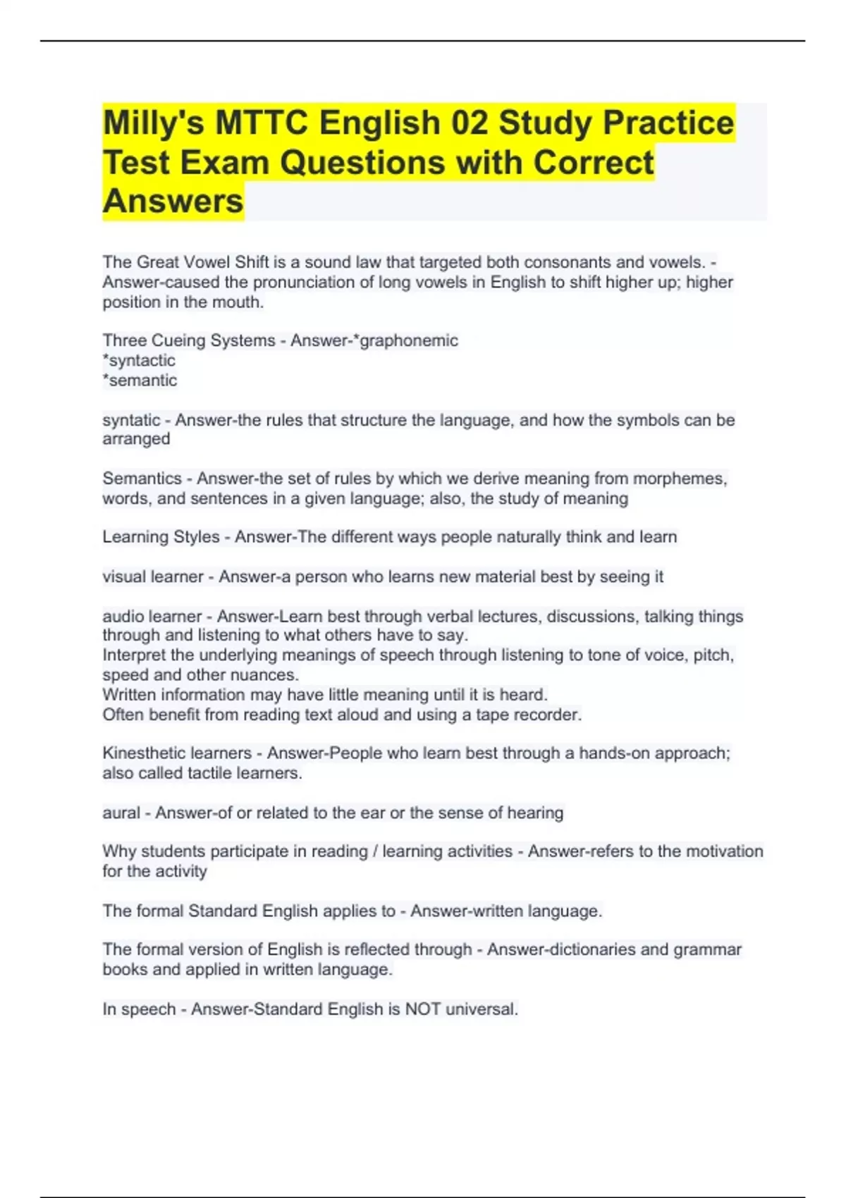 The Great Vowel Shift is a sound law that targeted both consonants and vowels. - Answer-caused the pronunciation of long vowels in English to shift higher up; higher position in the mouth. Three Cueing Systems - Answer-*graphonemic *syntactic *semantic syntatic - Answer-the rules that structure the language, and how the symbols can be arranged Semantics - Answer-the set of rules by which we derive meaning from morphemes, words, and sentences in a given language; also, the study of meaning Learning Styles - Answer-The different ways people naturally think and learn visual learner - Answer-a person who learns new material best by seeing it audio learner - Answer-Learn best through verbal lectures, discussions, talking things through and listening to what others have to say. Interpret the underlying meanings of speech through listening to tone of voice, pitch, speed and other nuances. Written information may have little meaning until it is heard. Often benefit from reading text aloud and using a tape recorder. Kinesthetic learners - Answer-People who learn best through a hands-on approach; also called tactile learners. aural - Answer-of or related to the ear or the sense of hearing Why students participate in reading / learning activities - Answer-refers to the motivation for the activity The formal Standard English applies to - Answer-written language. The formal version of English is reflected through - Answer-dictionaries and grammar books and applied in written language. In speech - Answer-Standard English is NOT universal.