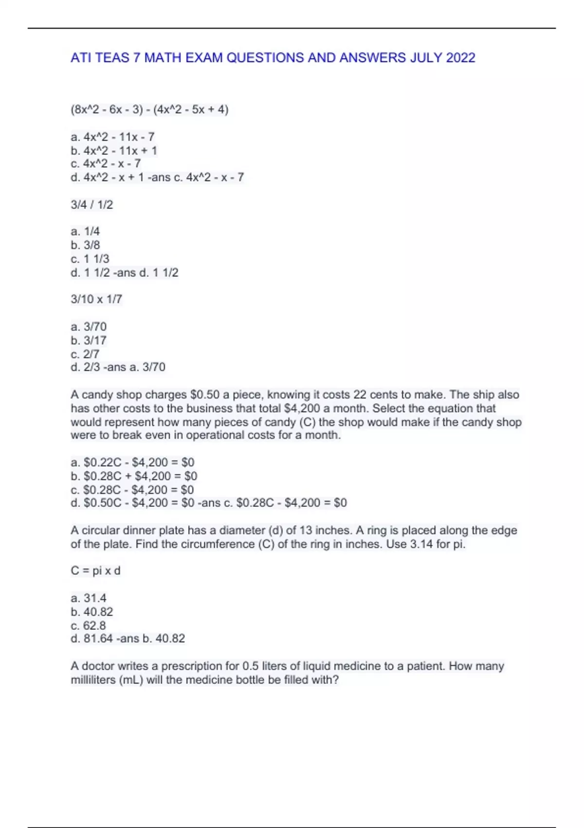 , ATI TEAS 7 MATH EXAM QUESTIONS AND ANSWERS JULY 2022