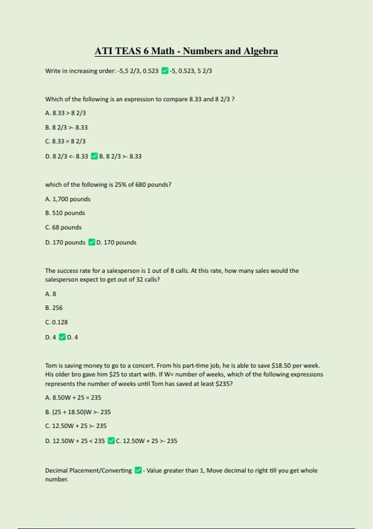 ATI TEAS 6 Math - Numbers and Algebra Write in increasing order: -5,5 2/3, 0.523 -5, 0.523, 5 2/3 Which of the following is an expression to compare 8.33 and 8 2/3 ? A. 8.33 8 2/3 B. 8 2/3 - 8.33 C. 8.33 = 8 2/3 D. 8 2/3 - 8.33 B. 8 2/3 - 8.33 which of the following is 25% of 680 pounds? A. 1,700 pounds B. 510 pounds C. 68 pounds D. 170 pounds D. 170 pounds The success rate for a salesperson is 1 out of 8 calls. At this rate, how many sales would the salesperson expect to get out of 32 calls? A. 8 B. 256 C. 0.128 D. 4 D. 4 Tom is saving money to go to a concert. From his part-time job, he is able to save $18.50 per week. His older bro gave him $25 to start with. If W= number of weeks, which of the following expressions represents the number of weeks until Tom has saved at least $235? A. 8.50W + 25 = 235 B. (25 + 18.50)W - 235 C. 12.50W + 25 - 235 D. 12.50W + 25 235 C. 12.50W + 25 - 235 Decimal Placement/Converting - Value greater than 1, Move decimal to right till you get whole number. - Number becomes numerator and 1 becomes denominator with the number of 0's that matches number of moves for decimal. = *Fraction* - Value less than 1. Use whole number as numerator and the *Place value* of *last decimal Digit* as denominator. =*Fraction* Percentage Convert to/from Decimal *TO* - Divide % by 100 then remove % symbol *FROM* - Multiply by 100 then add % symbol Percentage Convert to/from Fraction simplest form *TO* - Convert to decimal first (divide by 100) then put into *FROM* - Convert to decimal (multiply to get 100 in denominator then divide by denominator) then put decimal into % Fraction Convert to Decimal Order of Operations Divide numerator by denominator -PEMDAS (No exponent for TEAS 6) -Parentheses *FIRST* -Multiplication and Division *SECOND* (Left to Right) -Addition and Subtraction *THIRD* (Left to Right) Compare and Order Rational Numbers -*Rational Numbers*: -6 (-6/1), 5 (5/1), 100 (100/1) -*Irrational Numbers*: Square root (any prime number), pi -*Numeric Order*: Least to Greatest, Greatest to Least. Best in decimal form. Line them up vertically. -*Fraction/Fraction Form*: 5 2/7 (put into decimal) Divide 2 by 7 to get .2857 which will equal 5.2857 , __ Less than, IS fewer than Less than or equal to, is at most, is no more than , __ Greater than, IS more than Greater than or equal to, is at least, is no less than = Equal, equal to, is, was, were, will be, yields, becomes Common Denominator 1. Find least on on multiple of denominator 2. Change each fraction to make their denominator the same as least common denominator ~List multiples of each denominator and find SMALLEST number ~Multiply numerator by multiple of LCD, Use LCD as denominator Solve Equations in One Variable Collecting all variable terms to *one* side of the equal sign and all the constants on the other side, using addition or subtraction. Once all like terms are combined, last step is to divide. Could also be multiplication by the reciprocal ( One divided by original number). Extraneous Incorrect Story that is interesting containing details that aren't necessary to tell you what happened.