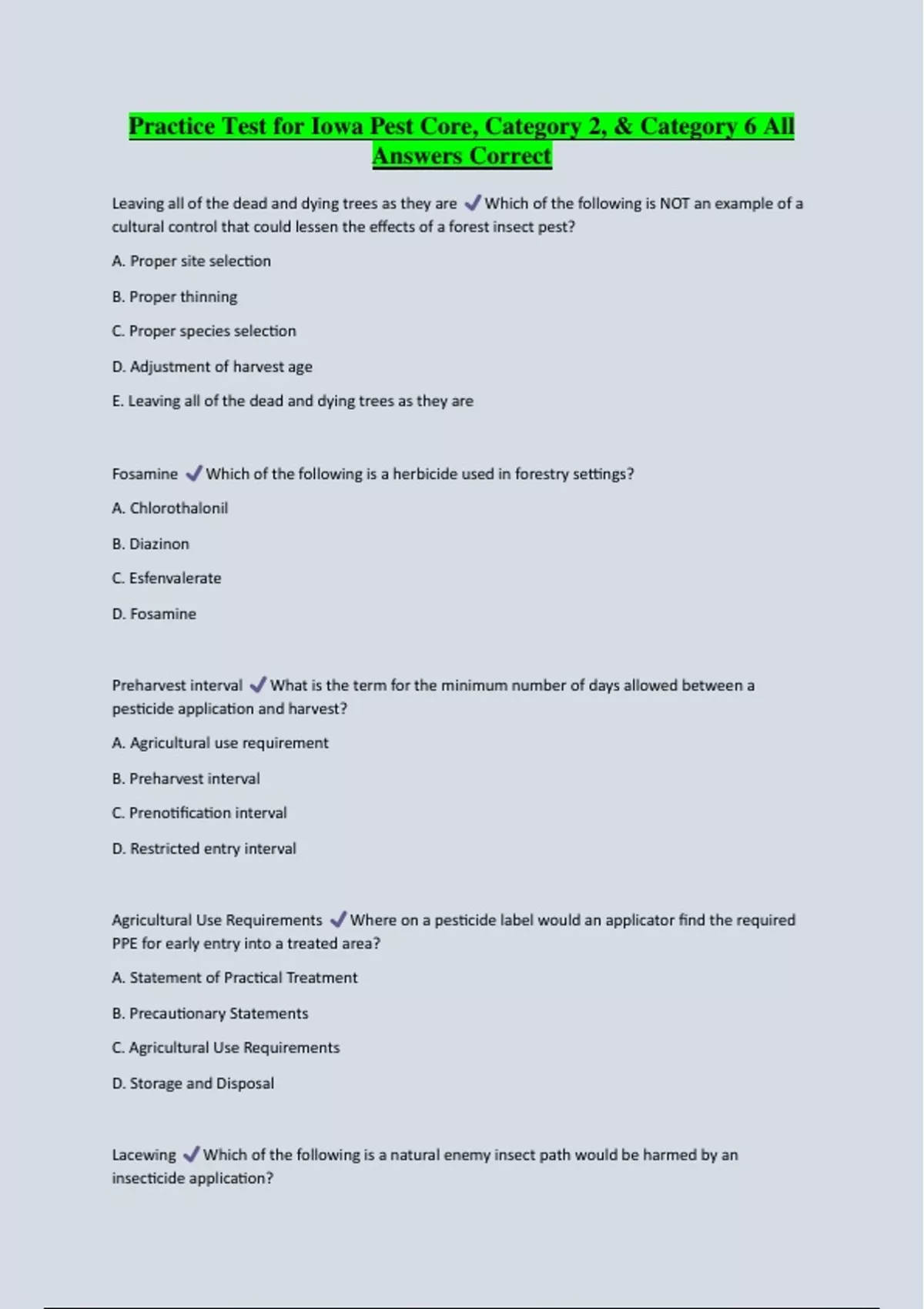 Practice Test for Iowa Pest Core, Category 2, & Category 6 All Answers Correct Leaving all of the dead and dying trees as they are Which of the following is NOT an example of a cultural control that could lessen the effects of a forest insect pest? A. Proper site selection B. Proper thinning C. Proper species selection D. Adjustment of harvest age E. Leaving all of the dead and dying trees as they are Fosamine Which of the following is a herbicide used in forestry settings? A. Chlorothalonil B. Diazinon C. Esfenvalerate D. Fosamine Preharvest interval What is the term for the minimum number of days allowed between a pesticide application and harvest? A. Agricultural use requirement B. Preharvest interval C. Prenotification interval D. Restricted entry interval Agricultural Use Requirements Where on a pesticide label would an applicator find the required PPE for early entry into a treated area? A. Statement of Practical Treatment B. Precautionary Statements C. Agricultural Use Requirements D. Storage and Disposal Lacewing Which of the following is a natural enemy insect path would be harmed by an insecticide application? A. Cicada B. Lacewing C. Sawfly D. Woodwasp Carpenterworm A. Carpenterworm B. Fall cankerworm Which caterpillar has the largest moth? C. Variable oakleaf caterpillar D. Walnut caterpillar What does the The amount of pesticide needed to kill one-half of a population of test animals LD50 of a pesticide indicate? A. The amount of pesticide needed to exceed residue tolerances for one-half of the commodity grown. B. The amount of pesticide needed to degrade to one-half its concentration in a given time C. The amount of pesticide needed to induce sickness in one-half of a population of test animals D. The amount of pesticide needed to kill one-half of a population of test animals Metallic green adults longer than the width of a penny with the emerald ash borer A. Metallic green adults longer than the width of a penny B. Larval galleries have a serpentine S-shape pattern What symptom or sign is NOT associated C. Cream white larvae with 10 bell-shaped abdominal segments D. D-shaped emergence hole chewed through the ash tree bark False True or False: The Worker Protection Standard (WPS) only applies to persons who actually handle pesticides. False True or False: General-use pesticides are not covered by the WPS Which publication How to Comply with the Worker Protection Standard for Agricultural Pesticides provides information to help you comply with the WPS? A. How to Comply with the Worker Protection Standard for Agricultural Pesticides B. Nature News C. Farmers Almanac Entering a greenhouse or other enclosed area after application and before the inhalation exposure level listed on the product label has been reached or one of the WPS ventilation criteria has been met When does a worker become a pesticide handler? A. Handling pesticide containers that have been emptied and cleaned according to product labeling B. Handling unopened pesticide containers and not, at the same time, involve in mixing, loading, applying, or cleaning C. Entering a greenhouse or other enclosed area after application and before the inhalation exposure level listed on the product label has been reached or one of the WPS ventilation criteria has been met D. Working in areas adjacent to where pesticides have been applied False True or False: An employer where pesticides are applied must have, but not display, a EPA WPS poster; the name, address, and telephone number of the nearest medical facility; and specific information about each pesticide application from the time the application begins until 30 days after the restricted-entry interval (REI). True True or False: If the workplace is a forest, you may display the EPA WPS poster; the name, address, and telephone number of the nearest medical facility; and specific information about each pesticide application near instead of in the forest.
