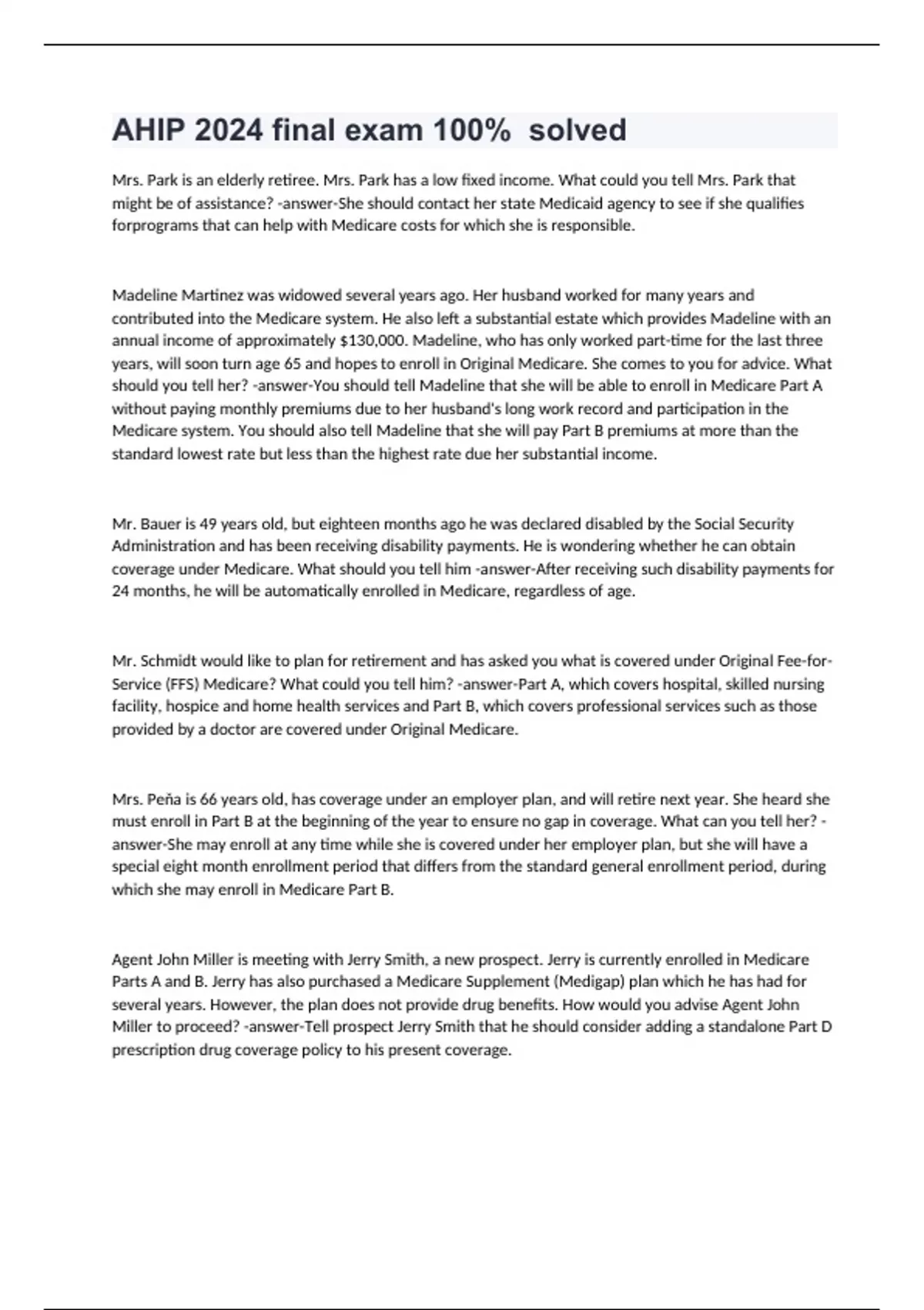AHIP 2024 final exam 100% solved Mrs. Park is an elderly retiree. Mrs. Park has a low fixed income. What could you tell Mrs. Park that might be of assistance? -answer-She should contact her state Medicaid agency to see if she qualifies forprograms that can help with Medicare costs for which she is responsible. Madeline Martinez was widowed several years ago. Her husband worked for many years and contributed into the Medicare system. He also left a substantial estate which provides Madeline with an annual income of approximately $130,000. Madeline, who has only worked part-time for the last three years, will soon turn age 65 and hopes to enroll in Original Medicare. She comes to you for advice. What should you tell her? -answer-You should tell Madeline that she will be able to enroll in Medicare Part A without paying monthly premiums due to her husband's long work record and participation in the Medicare system. You should also tell Madeline that she will pay Part B premiums at more than the standard lowest rate but less than the highest rate due her substantial income. Mr. Bauer is 49 years old, but eighteen months ago he was declared disabled by the Social Security Administration and has been receiving disability payments. He is wondering whether he can obtain coverage under Medicare. What should you tell him -answer-After receiving such disability payments for 24 months, he will be automatically enrolled in Medicare, regardless of age. Mr. Schmidt would like to plan for retirement and has asked you what is covered under Original Fee-for-Service (FFS) Medicare? What could you tell him? -answer-Part A, which covers hospital, skilled nursing facility, hospice and home health services and Part B, which covers professional services such as those provided by a doctor are covered under Original Medicare. Mrs. Peňa is 66 years old, has coverage under an employer plan, and will retire next year. She heard she must enroll in Part B at the beginning of the year to ensure no gap in coverage. What can you tell her? -answer-She may enroll at any time while she is covered under her employer plan, but she will have a special eight month enrollment period that differs from the standard general enrollment period, during which she may enroll in Medicare Part B. Agent John Miller is meeting with Jerry Smith, a new prospect. Jerry is currently enrolled in Medicare Parts A and B. Jerry has also purchased a Medicare Supplement (Medigap) plan which he has had for several years. However, the plan does not provide drug benefits. How would you advise Agent John Miller to proceed? -answer-Tell prospect Jerry Smith that he should consider adding a standalone Part D prescription drug coverage policy to his present coverage.
