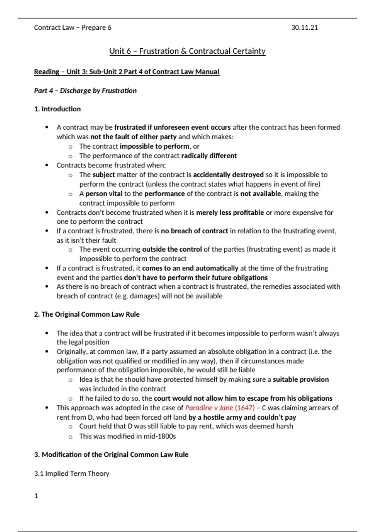 Summary Unit 6 - Frustration and Contractual Certainty