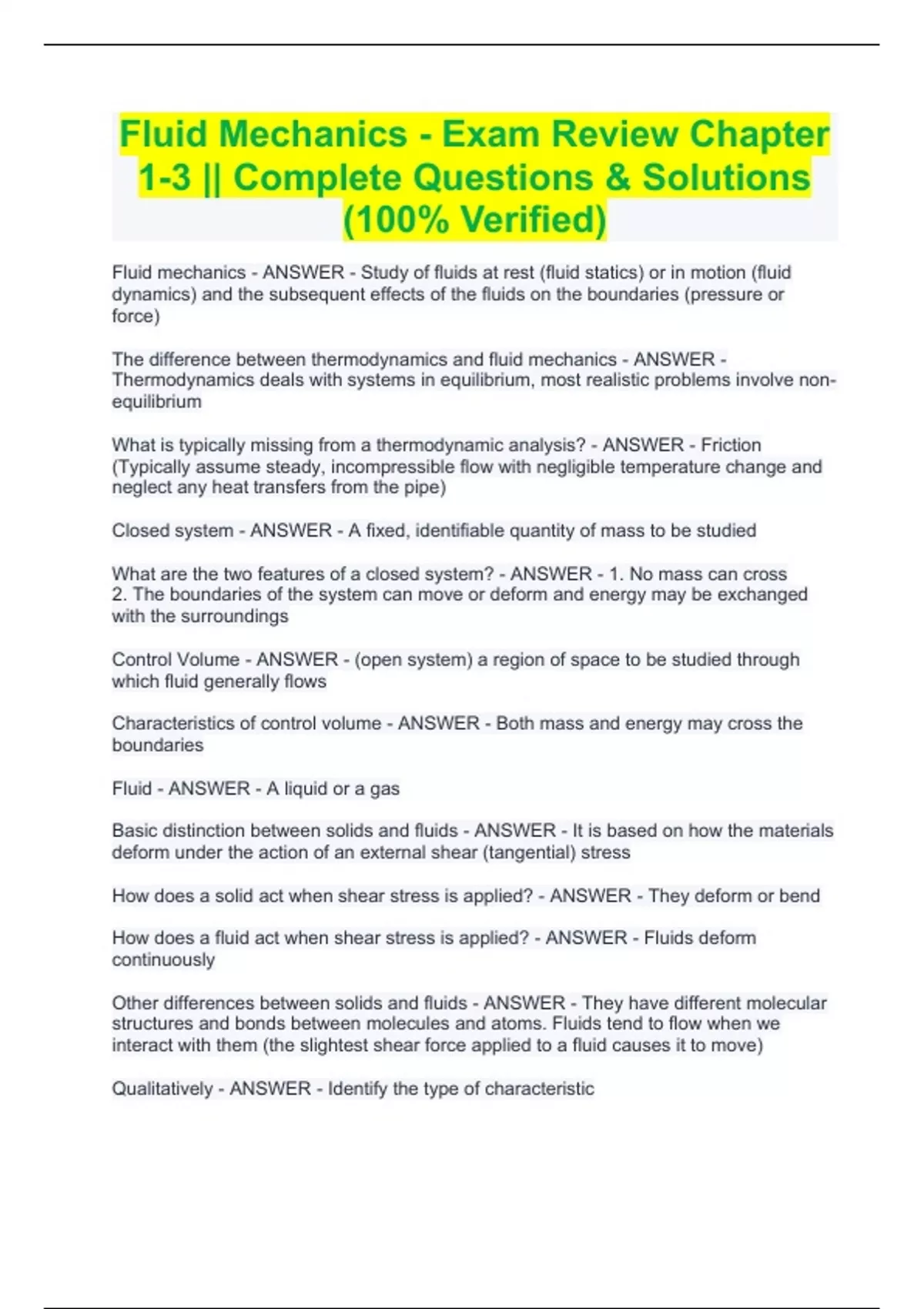 Fluid Mechanics - Exam Review Chapter 1-3 || Complete Questions & Solutions (100% Verified) Fluid Mechanics - Exam Review Chapter 1-3 || Complete Questions & Solutions (100% Verified) Fluid mechanics - ANSWER - Study of fluids at rest (fluid statics) or in motion (fluid dynamics) and the subsequent effects of the fluids on the boundaries (pressure or force) The difference between thermodynamics and fluid mechanics - ANSWER - Thermodynamics deals with systems in equilibrium, most realistic problems involve non-equilibrium What is typically missing from a thermodynamic analysis? - ANSWER - Friction (Typically assume steady, incompressible flow with negligible temperature change and neglect any heat transfers from the pipe) Closed system - ANSWER - A fixed, identifiable quantity of mass to be studied What are the two features of a closed system? - ANSWER - 1. No mass can cross 2. The boundaries of the system can move or deform and energy may be exchanged with the surroundings Control Volume - ANSWER - (open system) a region of space to be studied through which fluid generally flows Characteristics of control volume - ANSWER - Both mass and energy may cross the boundaries Fluid - ANSWER - A liquid or a gas Basic distinction between solids and fluids - ANSWER - It is based on how the materials deform under the action of an external shear (tangential) stress How does a solid act when shear stress is applied? - ANSWER - They deform or bend How does a fluid act when shear stress is applied? - ANSWER - Fluids deform continuously Other differences between solids and fluids - ANSWER - They have different molecular structures and bonds between molecules and atoms. Fluids tend to flow when we interact with them (the slightest shear force applied to a fluid causes it to move) Qualitatively - ANSWER - Identify the type of characteristic