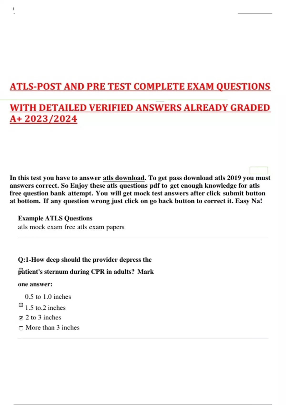 ATLS-POST AND PRE TEST COMPLETE EXAM QUESTIONS WITH DETAILED VERIFIED ANSWERS ALREADY GRADED A+ 2023/2024 In this test you have to answer atls download. To get pass download atls 2019 you must answers correct. So Enjoy these atls questions pdf to get enough knowledge for atls free question bank attempt. You will get mock test answers after click submit button at bottom. If any question wrong just click on go back button to correct it. Easy Na! Example ATLS Questions atls mock exam free atls exam papers Q:1-How deep should the provider depress the patient's sternum during CPR in adults? Mark one answer: 0.5 to 1.0 inches 1.5 to.2 inches 2 to 3 inches More than 3 inches ATLS-POST 1 Q:2-A patient is involved in a motor vehicle accident. He has suffered multiple organ trauma and is listed in critical condition. He has suffered an open wound in his right lower extremity and has lost a significant amount of blood. The physician determines that the patient is in hypovolemic shock. What is the first parameter to change in hypovolemic shock? Mark one answer: Systolic blood pressure Pulse rate Respiratory rate Skin vasoconstriction Q:3-A 34-year-old with severe head trauma and elevated intracranial pressures is intubated. Which of the following should be the target for mechanical ventilation? Mark one answer: Set PaCO2 between 45-50 Set PaCO2 between 35-40 Set PaCO2 between 30-35 Set PaCO2 < 30 Q:4-A young motorcycle driver is thrown against a concrete bridge and sustains ATLS-POST 1 severe trauma about the face, with marked deformity and bleeding. Which of the following statements regarding this scenario is TRUE? Mark one answer: Cervical spine evaluation takes precedence over facial injuries LeFort fractures rarely cause severe hemorrhage Nasotracheal intubation must be done urgently to prevent airway obstruction Plain radiographs are preferred to CT in emergencies Q:5-Which US industry has the highest accidental death rate? Mark one answer: Construct ion Agricultu re Manufact