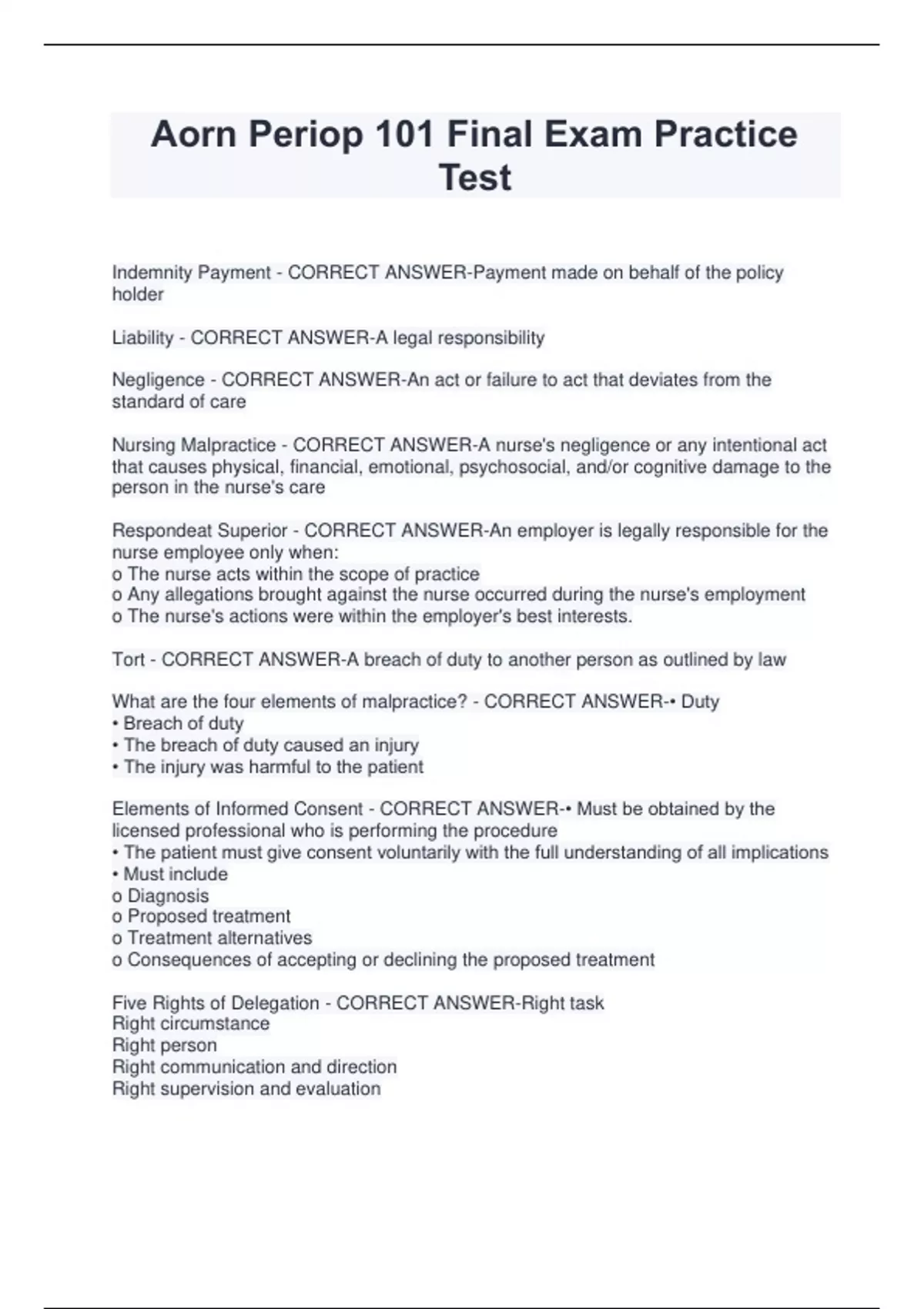 Aorn Periop 101 Final Exam Practice Test Indemnity Payment - CORRECT ANSWER-Payment made on behalf of the policy holder Liability - CORRECT ANSWER-A legal responsibility Negligence - CORRECT ANSWER-An act or failure to act that deviates from the standard of care Nursing Malpractice - CORRECT ANSWER-A nurse's negligence or any intentional act that causes physical, financial, emotional, psychosocial, and/or cognitive damage to the person in the nurse's care Respondeat Superior - CORRECT ANSWER-An employer is legally responsible for the nurse employee only when: o The nurse acts within the scope of practice o Any allegations brought against the nurse occurred during the nurse's employment o The nurse's actions were within the employer's best interests. Tort - CORRECT ANSWER-A breach of duty to another person as outlined by law What are the four elements of malpractice? - CORRECT ANSWER-• Duty • Breach of duty • The breach of duty caused an injury • The injury was harmful to the patient Elements of Informed Consent - CORRECT ANSWER-• Must be obtained by the licensed professional who is performing the procedure • The patient must give consent voluntarily with the full understanding of all implications • Must include o Diagnosis o Proposed treatment o Treatment alternatives o Consequences of accepting or declining the proposed treatment Five Rights of Delegation - CORRECT ANSWER-Right task Right circumstance Right person Right communication and direction Right supervision and evaluation Four types of patient privacy health care providers and personnel have an ethical and legal responsibility to always maintain - CORRECT ANSWER-• Medical information • Physical exposure • Personal privacy • Electronic privacy Eight factors to consider before determining what anesthetic to use for a particular patient - CORRECT ANSWER-• Patient's age • Length & type of surgery • Patient & surgeon preferences • Patient's co-existing diseases • Patient's mental & psychological status • Patient's previous experiences with anesthesia • Plans & protocols for postoperative pain management • Position of the patient during surgery The American Society of Anesthesiologist's NPO Guidelines - CORRECT ANSWER-• Clear liquids - stop 2 hours before surgery • Breast milk - stop 4 hours before surgery • Infant formula - stop 6 hours before surgery • Light meal (toast & a clear liquid) - stop 6 hours before surgery • Fried foods, fatty foods, meat - stop 8 hours before surgery Circulator RN duties during Induction of anesthesia and assisting anesthesia professional with Cricoid Pressure - CORRECT ANSWER-• Cricoid pressure application is not released until the endotracheal (ET) tube cuff is inflated, tube placement is confirmed, and anesthesia provider has given a verbal confirmation to the nurse that the cricoid pressure can be released. • If intubation or ventilation of the patient becomes difficult, the perioperative nurse should retrieve additional airway equipment and supplies. General anesthesia - CORRECT ANSWER-•