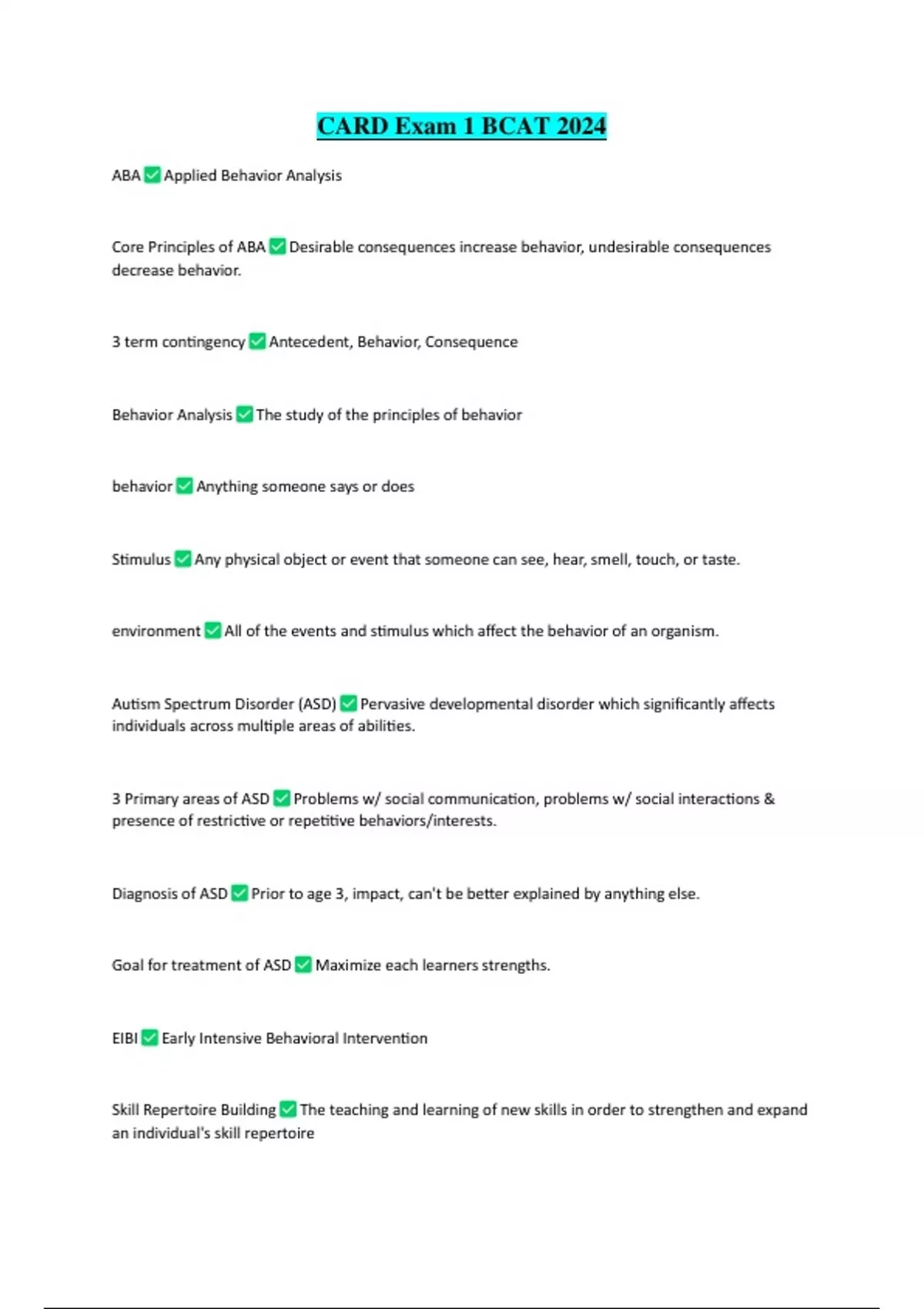 CARD Exam 1 BCAT 2024 ABA Applied Behavior Analysis Core Principles of ABA decrease behavior. Desirable consequences increase behavior, undesirable consequences 3 term contingency Antecedent, Behavior, Consequence Behavior Analysis behavior The study of the principles of behavior Anything someone says or does Stimulus Any physical object or event that someone can see, hear, smell, touch, or taste. environment All of the events and stimulus which affect the behavior of an organism. Autism Spectrum Disorder (ASD) Pervasive developmental disorder which significantly affects individuals across multiple areas of abilities. 3 Primary areas of ASD Problems w/ social communication, problems w/ social interactions & presence of restrictive or repetitive behaviors/interests. Diagnosis of ASD Prior to age 3, impact, can't be better explained by anything else. Goal for treatment of ASD EIBI Maximize each learners strengths. Early Intensive Behavioral Intervention Skill Repertoire Building The teaching and learning of new skills in order to strengthen and expand an individual's skill repertoire Discrete Trial Teaching, Natural Environment 3 prominent behavioral teaching approaches Training, Fluency Based Instruction (FBI) Discrete Trial Structured teaching method consisting of clear and direct presentation of learning trials to promote skill acquisition. Natural environment training Fluency Based Instruction Naturalistic teaching strategy. Taking an existing skill and increasing accuracy and speed of skill performance in order to develop competence primary reinforcer (food, drink) secondary reinforcer Reinforcer an innately reinforcing stimulus, such as one that satisfies a biological need a reinforcer that someone had to learn to like (games, coloring, puzzles etc) occurs after the behavior for the given SD Preference Assessment Aims to identify an individual's favorite things so that they can be used as rewards or potential "reinforcers" for desired behavior. Forced/Paired preference assessment Giving the learner just two options to identify what the individual wants. Can be given different options if not interested. multiple stimulus assessment An array of potential reinforcers is presented to the individual Prompts Urge for action, occurs around the time we present the SD Prompt Fading to reduce assistance to a least intrusive prompt prompt dependency requiring a prompt to perform a task Stimulus prompts Addition to or alters the stimulus in order to facilitate a correct response. (Manipulate) response prompt an additional cue added to the learners response to facilitate a correct response physical prompt manual guidance to facilitate a correct response model prompt providing a physical demonstration of the SD echoic prompt verbal directive gesture prompt positional prompt within stimulus full prompt providing a vocal demonstration of the SD Giving verbal instructions to guide. May include textual or visual providing a movement cue altering the location of placement adding to or altering a portion of the stimulus the entire prompt is delivered to assist the learner partial prompt only a portion of the prompt is delivered to help the learner stimulation manipulation manipulating any stimulus to make the prompt easier for the learner full delivery the cards out." tell the learner exactly what to do. I.e.- "play uno" vs "go get the uno box, and take inadvertent prompt accidently giving away the correct response by body language or placement. (looking, placing object in middle, holding hand closer to object) Errorless learning ensures success, early immediate prompts, prompts faded over time, decreases frustration/increases motivation (used during initial teaching stages) Acquisition Learning of a new skill Acquisition skill/Target skill individual. Prompt Hierarchy The response to a new behavior that is currently being taught to the A systematic arrangement of prompts used in a particular order to facilitate learning. Time Delay Delay in time between the SD and the prompts Constant time delay Progressive time delay Always waiting the same amount of time ie. 2 seconds Gradually increasing the time between the SD and the prompt each time. ie 2 seconds, 3, 4.. and so on Error correction correct response. Procedure following and incorrect or non response to help the learner learn the Least to most prompting usually used for behaviors that have already been learned, but for some reason the student is not responding. No-no prompt Allowing the student to get the incorrect or not respond twice before using a prompt. Shaping Systematically reinforcing successive approximations of a target behavior. reinforcing as it gradually becomes closer to the desired skill. Previous approximations will no longer be reinforced