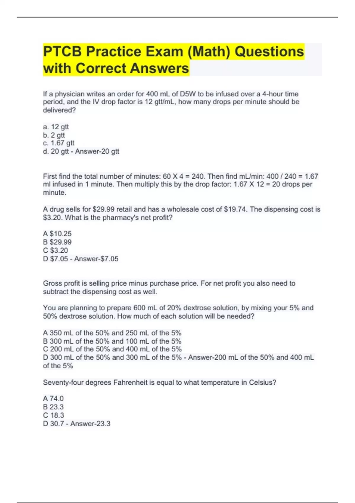PTCB Practice Exam (Math) Questions with Correct Answers