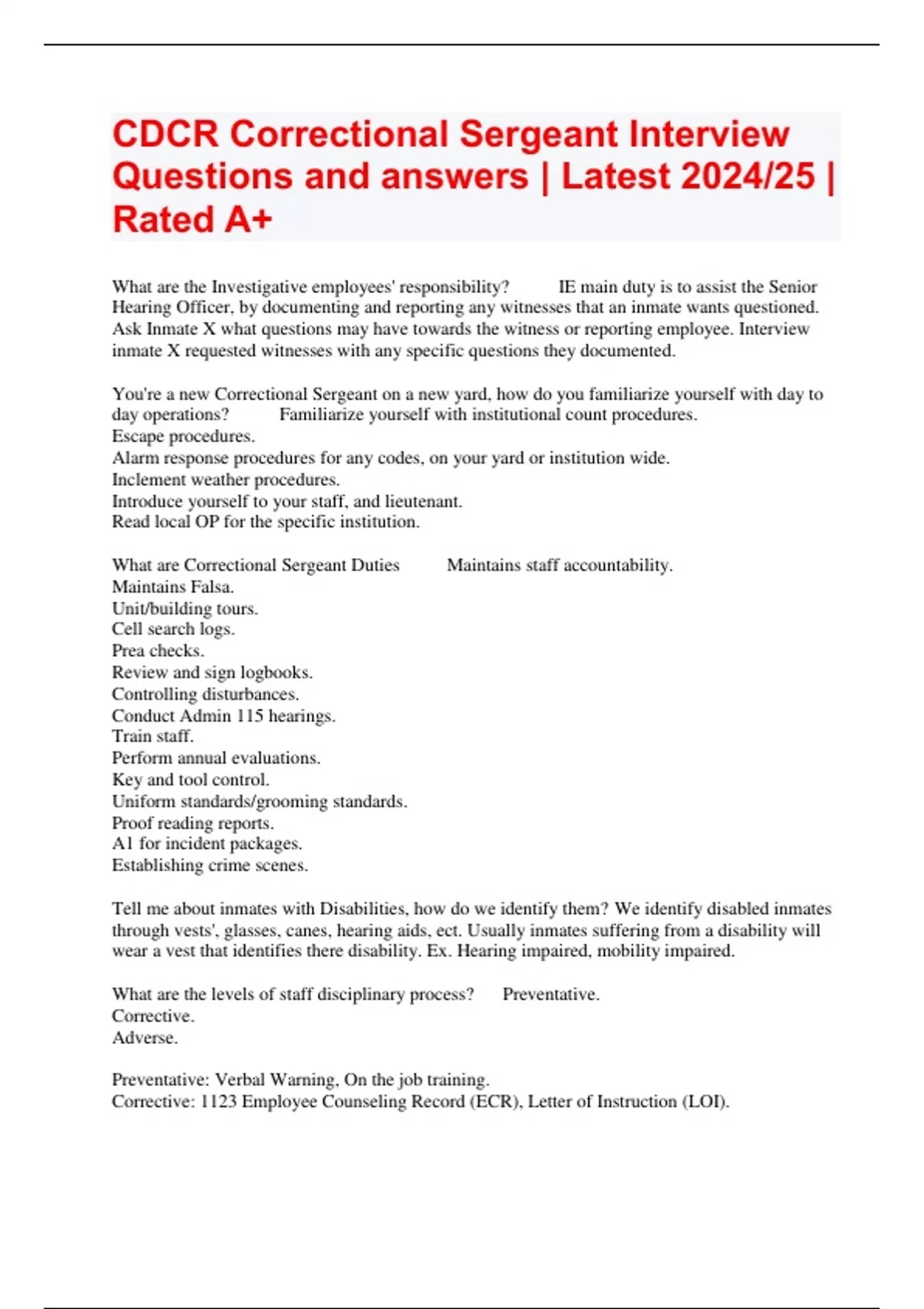 CDCR Correctional Sergeant Interview Questions and answers | Latest 2024/25 | Rated A+