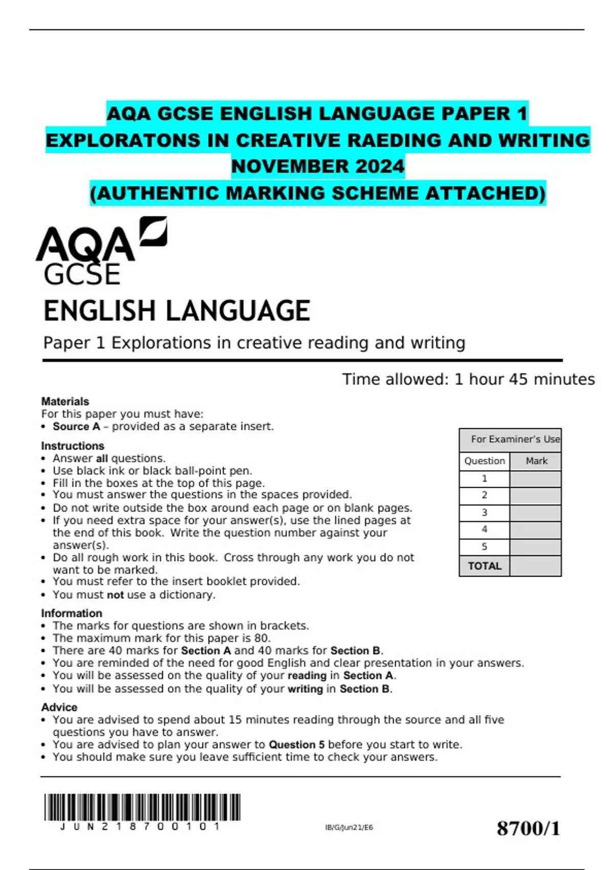 AQA GCSE ENGLISH LANGUAGE PAPER 1 EXPLORATONS IN CREATIVE RAEDING AND WRITING NOVEMBER 2024 (AUTHENTIC MARKING SCHEME ATTACHED)