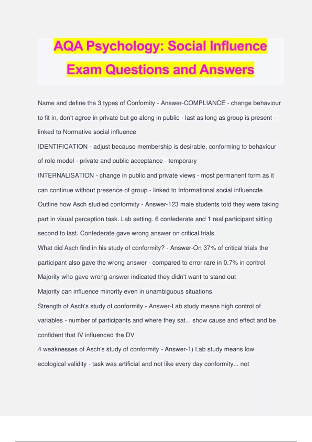 AQA Psychology: Social Influence Exam Questions and Answers Name and define the 3 types of Confomity - Answer-COMPLIANCE - change behaviour to fit in, don't agree in private but go along in public - last as long as group is present - linked to Normative social influence IDENTIFICATION - adjust because membership is desirable, conforming to behaviour of role model - private and public acceptance - temporary INTERNALISATION - change in public and private views - most permanent form as it can continue without presence of group - linked to Informational social influencde Outline how Asch studied conformity - Answer-123 male students told they were taking part in visual perception task. Lab setting. 6 confederate and 1 real participant sitting second to last. Confederate gave wrong answer on critical trials What did Asch find in his study of conformity? - Answer-On 37% of critical trials the participant also gave the wrong answer - compared to error rare in 0.7% in control Majority who gave wrong answer indicated they didn't want to stand out Majority can influence minority even in unambiguous situations Strength of Asch's study of conformity - Answer-Lab study means high control of variables - number of participants and where they sat... show cause and effect and be confident that IV influenced the DV 4 weaknesses of Asch's study of conformity - Answer-1) Lab study means low ecological validity - task was artificial and not like every day conformity... not generalised to conformity in real like. Only assessed conformity in strangers, been found even greater among friends 2) Biased sample - male... lacks population validity and may not represent conformity in females 3) Lacks historical validity - 1950's America was more conformist - Perrin and Spencer = replication using engineering students in UK and found 1/396 trials did a student conform - cultural change and people are possibly less conformist today... not reflective of conformity in today's society and Asch's study is a child of its time 4) Ethical issues - didn't provide fully informed consent and misled about key aspects of procedures and place in difficult and embarrassing position... psychological harm 3 variables affecting conformity and research support - Answer-UNANIMITY - conformity rates increase when majority influence is unanimous - ASCH - one confederate who went against others - dropped from 37% to 5.5%. If rebel went against others and real answer still dropped to 9% TASK DIFFICULTY - greater conformity rates when task difficulty increases as right answer is less obvious so look for guidance - ASCH - increased task difficulty but making comparison lines close in length and found more likely to conform to wrong answer GROUP SIZE - conformity rates increase as size of group increases up to a point - ASCH - altered group size by having different numbers of confederates - 3 conformity increased but addition of further confederates made little difference Normative social influence as an EXPLANATION for conformity + evaluation - Answer- based on desire to be liked, acceptance and belonging to a group - rewarding and have the power to punish others - Explain compliance as may conform on surface but privately maintain own views ASCH - interviewed after experiment, participants who conformed said they knew the answer they gave was wrong but thought they would have looked stupid... shows conforming to be accepted GARANDEAU & CILLESSEN - people who do not have many close friendships tended to be manipulated more easily by bullies to be accepted Informational social influence as an EXPLANATION for conformity + evaluation - Answer-based on desire to be right, conform because do not know what to so but want to be correct. Believe majority is likely to know more and give info about how to behave - involves internalisation