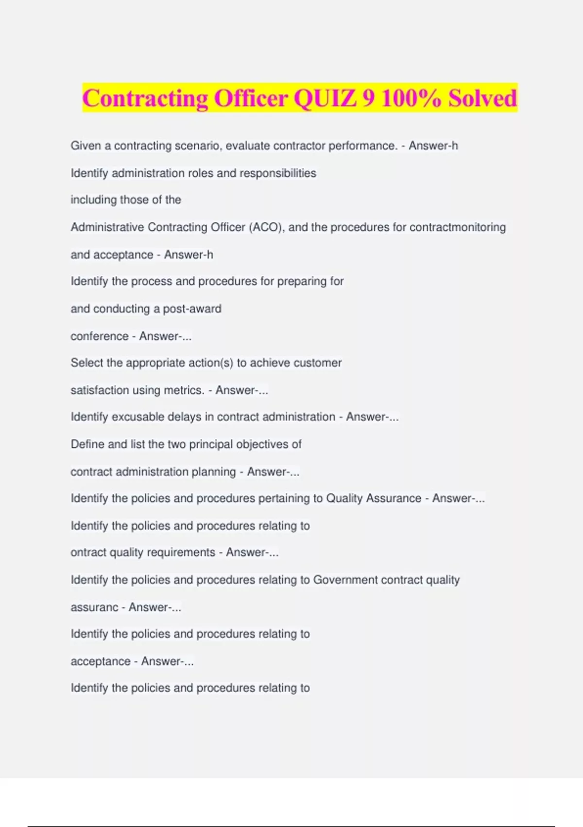 Contracting Officer QUIZ 9 100% Solved Given a contracting scenario, evaluate contractor performance. - Answer-h Identify administration roles and responsibilities including those of the Administrative Contracting Officer (ACO), and the procedures for contractmonitoring and acceptance - Answer-h Identify the process and procedures for preparing for and conducting a post-award conference - Answer-... Select the appropriate action(s) to achieve customer satisfaction using metrics. - Answer-... Identify excusable delays in contract administration - Answer-... Define and list the two principal objectives of contract administration planning - Answer-... Identify the policies and procedures pertaining to Quality Assurance - Answer-... Identify the policies and procedures relating to ontract quality requirements - Answer-... Identify the policies and procedures relating to Government contract quality assuranc - Answer-... Identify the policies and procedures relating to acceptance - Answer-... Identify the policies and procedures relating to warranties - Answer-... Acceptance - Answer-...The act of an authorized representative of the Government by which the Government assumes ownership of existing identified supplies or approves specific services rendered as partial or complete performance of a contract. Conditional acceptance - Answer-...Acceptance of supplies or services that do not conform to contract quality requirements, or are otherwise incomplete, that the contractor is required to correct or otherwise complete by a specified date Contract quality requirements - Answer-...technical requirements in the contract relating to the quality of the product or service and those contract clauses prescribing inspection;, and other quality controls incumbent on the contractor, to assure that the product or service conforms to the contractual requirements
