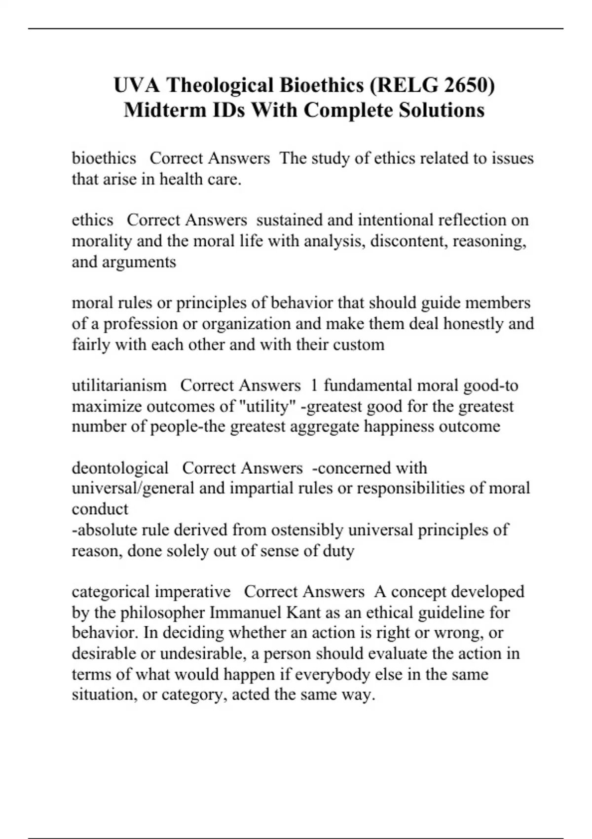 UVA Theological Bioethics (RELG 2650) Midterm IDs Questions With Complete Solutions
