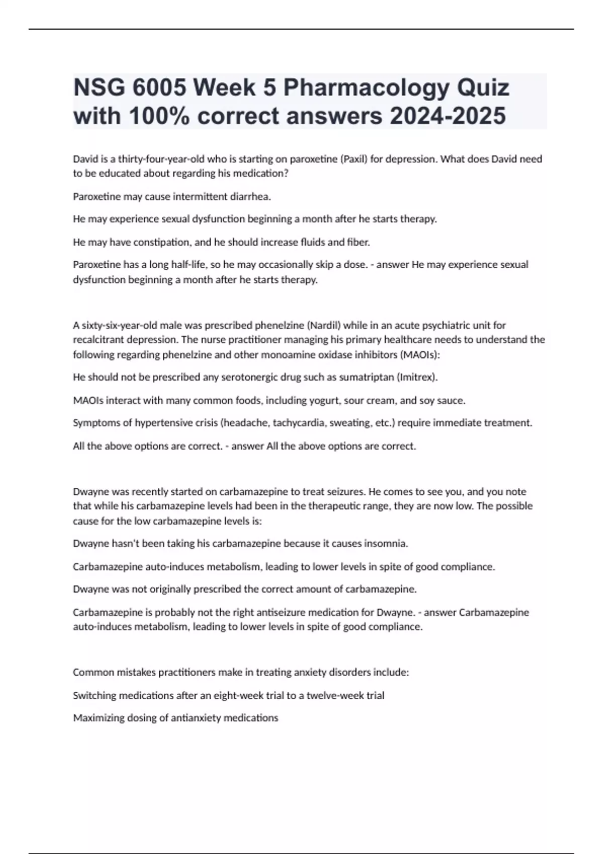 David is a thirty-four-year-old who is starting on paroxetine (Paxil) for depression. What does David need to be educated about regarding his medication? Paroxetine may cause intermittent diarrhea. He may experience sexual dysfunction beginning a month after he starts therapy. He may have constipation, and he should increase fluids and fiber. Paroxetine has a long half-life, so he may occasionally skip a dose. He may experience sexual dysfunction beginning a month after he starts therapy. A sixty-six-year-old male was prescribed phenelzine (Nardil) while in an acute psychiatric unit for recalcitrant depression. The nurse practitioner managing his primary healthcare needs to understand the following regarding phenelzine and other monoamine oxidase inhibitors (MAOIs): He should not be prescribed any serotonergic drug such as sumatriptan (Imitrex). MAOIs interact with many common foods, including yogurt, sour cream, and soy sauce. Symptoms of hypertensive crisis (headache, tachycardia, sweating, etc.) require immediate treatment. All the above options are correct. All the above options are correct. Brainpower Read More Previous Play Next Rewind 10 seconds Move forward 10 seconds Unmute 0:00 / 0:00 Full screen Dwayne was recently started on carbamazepine to treat seizures. He comes to see you, and you note that while his carbamazepine levels had been in the therapeutic range, they are now low. The possible cause for the low carbamazepine levels is: Dwayne hasn't been taking his carbamazepine because it causes insomnia. Carbamazepine auto-induces metabolism, leading to lower levels in spite of good compliance. Dwayne was not originally prescribed the correct amount of carbamazepine. Carbamazepine is probably not the right antiseizure medication for Dwayne. Carbamazepine auto-induces metabolism, leading to lower levels in spite of good compliance. Common mistakes practitioners make in treating anxiety disorders include: Switching medications after an eight-week trial to a twelve-week trial Maximizing dosing of antianxiety medications Encouraging exercise and relaxation therapy before starting medication Thinking a partial response to medication is acceptable Thinking a partial response to medication is acceptable Six-year-old Lucy has recently been started on ethosuximide (Zarontin) for seizures. She should be monitored for: Increased seizure activity as this drug may auto-induce seizures Altered renal function, including renal failure Blood dyscrasias, which are uncommon but possible CNS excitement, leading to insomnia Blood dyscrasias, which are uncommon but possible An appropriate first-line drug for the treatment of depression with fatigue and low energy would be: Venlafaxine (Effexor) Escitalopram (Lexapro) Buspirone (Buspar) Amitriptyline (Elavil) Venlafaxine (Effexor) When prescribing Adderall (amphetamine and dextroamphetamine) to adults with ADHD, the nurse practitioner will need to monitor: The blood pressure Blood glucose levels Urine ketone levels Liver function The blood pressure Patients should be instructed regarding the rapid onset of zolpidem (Ambien) because: Zolpidem should be taken just before going to bed. Zolpidem may cause a dry mouth and constipation. Patients may need to double the dose for effectiveness. Patients should stop drinking alcohol at least thirty minutes before taking zolpidem. Zolpidem should be taken just before going to bed. Anticholinergic agents, such as benztropine (Cogentin), may be given with a phenothiazine to: Reduce the chance of tardive dyskinesia. Potentiate the effects of the drug. Reduce the tolerance that tends to occur. Increase CNS depression. Reduce the chance of tardive dyskinesia. Jack, eight years old, has attention deficit disorder (ADD) and is prescribed methylphenidate (Ritalin). He and his parents should be educated about the side effects of methylphenidate, which are: Slurred speech and insomnia Bradycardia and confusion Dizziness and orthostatic hypotension Insomnia and decreased appetite Insomnia and decreased appetite Patients who are prescribed olanzapine (Zyprexa) should be monitored for: Insomnia Weight gain Hypertension Galactorrhea Weight gain Levetiracetam has known drug interactions with: Oral contraceptives Carbamazepine Warfarin Few, if any, drugs Few, if any, drugs Cara is taking levetiracetam (Keppra) to treat seizures. Routine education for levetiracetam includes reminding her: To not abruptly discontinue levetiracetam due to the risk of withdrawal seizures To wear a sunscreen due to photosensitivity from levetiracetam To get an annual eye exam while on levetiracetam To report weight loss if it occurs To not abruptly discontinue levetiracetam due to the risk of withdrawal seizures