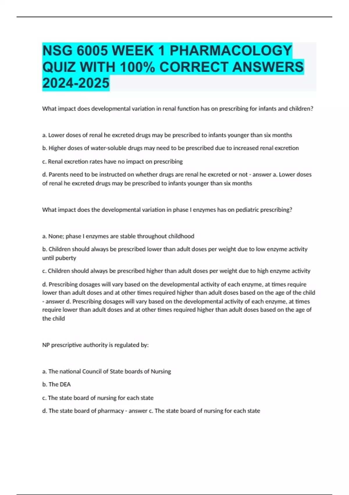 What impact does developmental variation in renal function has on prescribing for infants and children? a. Lower doses of renal he excreted drugs may be prescribed to infants younger than six months b. Higher doses of water-soluble drugs may need to be prescribed due to increased renal excretion c. Renal excretion rates have no impact on prescribing d. Parents need to be instructed on whether drugs are renal he excreted or not a. Lower doses of renal he excreted drugs may be prescribed to infants younger than six months What impact does the developmental variation in phase I enzymes has on pediatric prescribing? a. None; phase I enzymes are stable throughout childhood b. Children should always be prescribed lower than adult doses per weight due to low enzyme activity until puberty c. Children should always be prescribed higher than adult doses per weight due to high enzyme activity d. Prescribing dosages will vary based on the developmental activity of each enzyme, at times require lower than adult doses and at other times required higher than adult doses based on the age of the child d. Prescribing dosages will vary based on the developmental activity of each enzyme, at times require lower than adult doses and at other times required higher than adult doses based on the age of the child Brainpower Read More Previous Play Next Rewind 10 seconds Move forward 10 seconds Unmute 0:00 / 0:15 Full screen NP prescriptive authority is regulated by: a. The national Council of State boards of Nursing b. The DEA c. The state board of nursing for each state d. The state board of pharmacy c. The state board of nursing for each state The FDA regulates: a. Prescribing of drugs by doctors of medicine (MD) and NPs b. The official labeling for all prescriptions and over-the-counter drugs c. Off label recommendations for prescribing d. Pharmaceutical educational offerings b. The official labeling for all prescriptions and over-the-counter drugs Lisa is breast-feeding her two-month-old son, and she has an infection that requires an antibiotic what drug factors influence the effect of the drug on the infant? a. Maternal drug levels b. Half-Life c. Lipid solubility d. All of the above d. All of the above Drugs that are absolutely contraindicated in lactating women include: a. Selective serotonin reuptake inhibitors b. Antiepileptic drugs such as carbamazepine c. Anti-neoplasm of drugs such as methotrexate d. All of the above d. All of the above The DEA: a. Registers manufacturers and prescribes controlled substances b. Regulates NP prescribing At the state level c. Sanctions providers who prescribe drugs off label d. Provides prescribers with a number they can use for insurance Billing a. Registers manufacturers and prescribes c