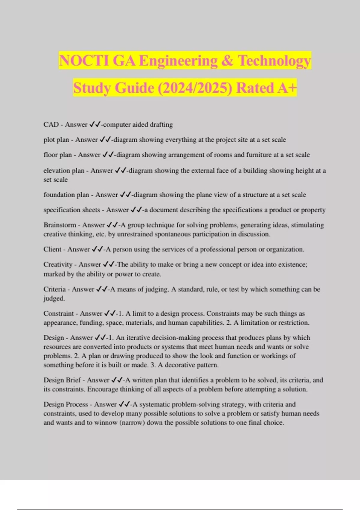 NOCTI GA Engineering & Technology Study Guide (2024/2025) Rated A+ CAD - Answer ️️ -computer aided drafting plot plan - Answer ️️ -diagram showing everything at the project site at a set scale floor plan - Answer ️️ -diagram showing arrangement of rooms and furniture at a set scale elevation plan - Answer ️️ -diagram showing the external face of a building showing height at a set scale foundation plan - Answer ️️ -diagram showing the plane view of a structure at a set scale specification sheets - Answer ️️ -a document describing the specifications a product or property Brainstorm - Answer ️️ -A group technique for solving problems, generating ideas, stimulating creative thinking, etc. by unrestrained spontaneous participation in discussion. Client - Answer ️️ -A person using the services of a professional person or organization. Creativity - Answer ️️ -The ability to make or bring a new concept or idea into existence; marked by the ability or power to create. Criteria - Answer ️️ -A means of judging. A standard, rule, or test by which something can be judged. Constraint - Answer ️️ -1. A limit to a design process. Constraints may be such things as appearance, funding, space, materials, and human capabilities. 2. A limitation or restriction. Design - Answer ️️ -1. An iterative decision-making process that produces plans by which resources are converted into products or systems that meet human needs and wants or solve problems. 2. A plan or drawing produced to show the look and function or workings of something before it is built or made. 3. A decorative pattern. Design Brief - Answer ️️ -A written plan that identifies a problem to be solved, its criteria, and its constraints. Encourage thinking of all aspects of a problem before attempting a solution. Design Process - Answer ️️ -A systematic problem-solving strategy, with criteria and constraints, used to develop many possible solutions to solve a problem or satisfy human needs and wants and to winnow (narrow) down the possible solutions to one final choice. Design Statement - Answer ️️ -A part of a design brief that challenges the designer, describes what a design solution should do without describing how to solve the problem, and identifies the degree to which the solution must be executed. Designer - Answer ️️ -A person who designs any of a variety of things. This usually implies the task of creating drawings or in some ways uses visual cues to organize his or her work. Engineer - Answer ️️ -A person who is trained in and uses technological and scientific knowledge to solve practical problems. Engineering Notebook - Answer ️️ -A book in which an engineer will formally document, in chronological order, all of his/her work that is associated with a specific design project. Innovation - Answer ️️ -An improvement of an existing technological product, system, or method of doing something. Invention - Answer ️️ -A new product, system, or process that has never existed before, created by study and experimentation. Iterative - Answer ️️ -A process that repeats a series of steps over and over until the desired outcome is obtained. Valid - Answer ️️ -Well-founded on evidence and corresponds accurately to the real world. open-looped - Answer ️️ -a system that has to have input each time the system is used feedback - Answer ️️ -fourth step of a system closed-looped - Answer ️️ -a system that has feedback process - Answer ️️ -second step of a system output - Answer ️️ -third step of a system subsystem - Answer ️️ -smaller systems intergrated into a larger system What are some important resources for engineering and technology? - Answer ️️ - People,Energy, Capital(Money), Information,Tools, Machines, Materials, and Time What is a system? - Answer ️️ -a set or group of parts that all work together, all of them include input, a process and an output What is a subsystem - Answer ️️ -a system that operates as part of another system What does constraint mean? - Answer ️️ -a limit, such as appearance, budget, space, materials, or human capital in the design process. ISO - Answer ️️ -International Standards Organiza