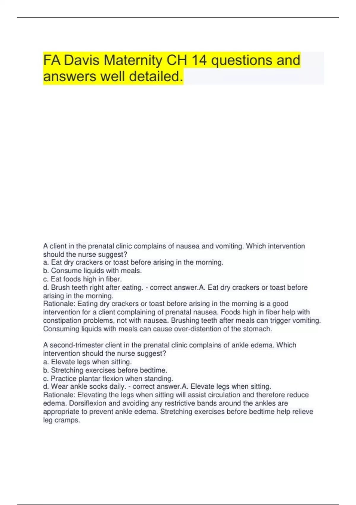 FA Davis Maternity CH 14 questions and answers well detailed. A client in the prenatal clinic complains of nausea and vomiting. Which intervention should the nurse suggest? a. Eat dry crackers or toast before arising in the morning. b. Consume liquids with meals. c. Eat foods high in fiber. d. Brush teeth right after eating. - correct answer.A. Eat dry crackers or toast before arising in the morning. Rationale: Eating dry crackers or toast before arising in the morning is a good intervention for a client complaining of prenatal nausea. Foods high in fiber help with constipation problems, not with nausea. Brushing teeth after meals can trigger vomiting. Consuming liquids with meals can cause over-distention of the stomach. A second-trimester client in the prenatal clinic complains of ankle edema. Which intervention should the nurse suggest? a. Elevate legs when sitting. b. Stretching exercises before bedtime. c. Practice plantar flexion when standing. d. Wear ankle socks daily. - correct answer.A. Elevate legs when sitting. Rationale: Elevating the legs when sitting will assist circulation and therefore reduce edema. Dorsiflexion and avoiding any restrictive bands around the ankles are appropriate to prevent ankle edema. Stretching exercises before bedtime help relieve leg cramps. A prenatal client at 10 weeks' gestation is complaining of urinary frequency. Which self-care strategy should the nurse teach? a. Empty bladder every 4 hours. b. Decrease the amount of fluid intake. c. Empty the bladder when the urge is felt. d. Empty bladder every hour. - correct answer.C. Empty the bladder when the urge is felt. Rationale: Fluid intake should be maintained at 2,000 mL, not decreased. The bladder should be emptied every 2 hours, not every hour (too frequent) or every 4 hours (not frequent enough). The bladder should be emptied when the urge is felt, not delayed. A prenatal client in the third trimester of pregnancy is diagnosed with varicosities in the vulva and perineum. Which self-care strategy should the nurse teach? a. Change shoes several times throughout the day. b. Elevate legs and feet while sitting or lying down. c. Elevate legs level with hips while sitting or lying down. d. Use supportive hose in the afternoon and evening. - correct answer.C. Elevate legs level with hips while sitting or lying down. Rationale: The hips, as well as the feet and legs, must be elevated to promote venous drainage into the trunk. Supportive hose need to be applied in the morning, rather than starting in the afternoon or evening. Changing shoes might help with back pain but not with varicosities. A pregnant client complains of severe heartburn. The nurse suggests which of the following relief measures for heartburn? a. Avoid fried and highly spiced foods. b. Lie down for half an hour after eating. c. Take a teaspoon of sodium bicarbonate in water after meals. d. Eat three well-spaced meals each day. - correct answer.A. Avoid fried and highly spiced foods. Rationale: Remedies for heartburn include eating small and more frequent meals; avoiding fried and highly spiced foods; and remaining upright for at least an hour after meals. Use of low- sodium antacids also may be suggested. The use of sodium bicarbonate should be discouraged. The nurse is teaching a group of prenatal clients about care of the breasts during pregnancy. Which self-care measure might be effective for women with inverted nipples? a. A bra with wide straps. b. A bra with tucks that allow expansion for breast tissue. c. Breast shields. d. A bra that supports the nipple between shoulder and elbow. - correct answer.C. Breast Shields Rationale: Breast shields designed to correct inverted nipples are effective for some women, but others gain no benefit from them. A well-fitting supportive bra that: (1) has