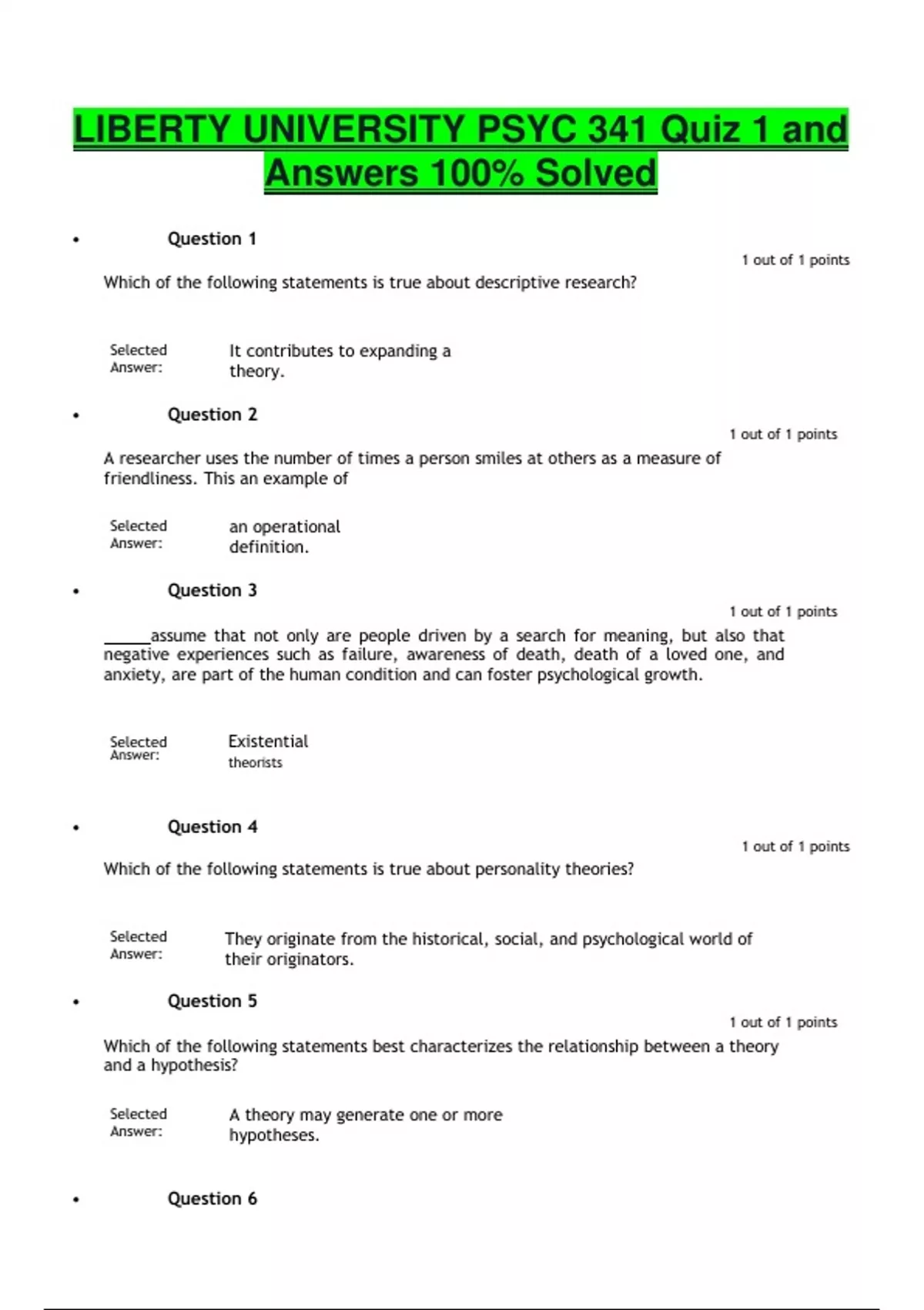 LIBERTY UNIVERSITY PSYC 341 Quiz 1 and Answers 100% Solved • Question 1 1 out of 1 points Which of the following statements is true about descriptive research? Selected Answer: It contributes to expanding a theory. • Question 2 1 out of 1 points A researcher uses the number of times a person smiles at others as a measure of friendliness. This an example of Selected Answer: an operational definition. • Question 3 1 out of 1 points assume that not only are people driven by a search for meaning, but also that negative experiences such as failure, awareness of death, death of a loved one, and anxiety, are part of the human condition and can foster psychological growth. Selected Existential Answer: theorists • Question 4 1 out of 1 points Which of the following statements is true about personality theories? Selected Answer: They originate from the historical, social, and psychological world of their originators. • Question 5 1 out of 1 points Which of the following statements best characterizes the relationship between a theory and a hypothesis? Selected Answer: A theory may generate one or more hypotheses. • Question 6