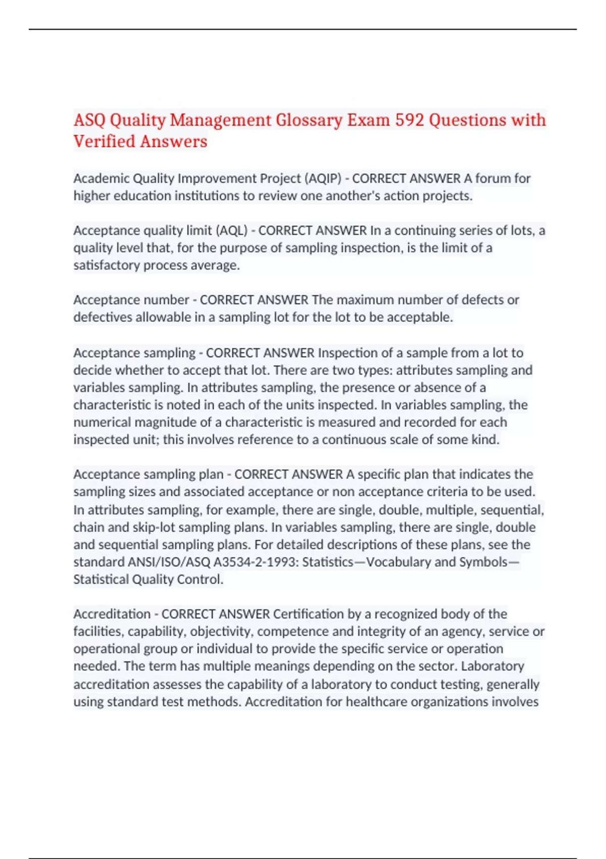 ASQ Quality Management Glossary Exam 592 Questions with Verified Answers,100% CORRECT