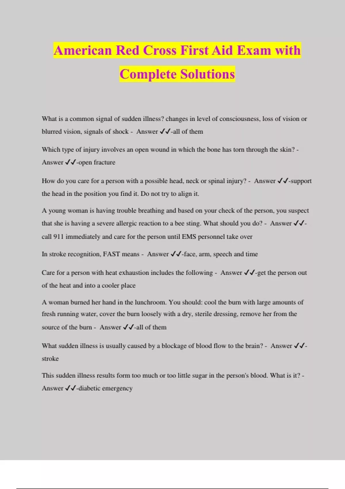 American Red Cross First Aid Exam with Complete Solutions What is a common signal of sudden illness? changes in level of consciousness, loss of vision or blurred vision, signals of shock - Answer ️️ -all of them Which type of injury involves an open wound in which the bone has torn through the skin? - Answer ️️ -open fracture How do you care for a person with a possible head, neck or spinal injury? - Answer ️️ -support the head in the position you find it. Do not try to align it. A young woman is having trouble breathing and based on your check of the person, you suspect that she is having a severe allergic reaction to a bee sting. What should you do? - Answer ️️ - call 911 immediately and care for the person until EMS personnel take over In stroke recognition, FAST means - Answer ️️ -face, arm, speech and time Care for a person with heat exhaustion includes the following - Answer ️️ -get the person out of the heat and into a cooler place