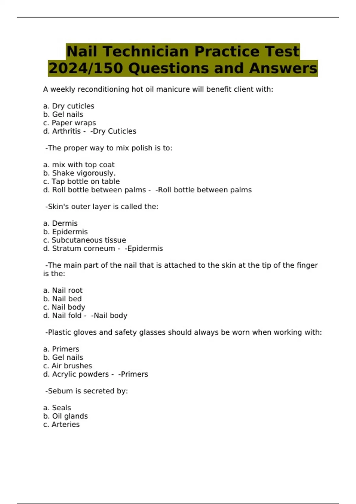 Nail Technician Practice Test 2024/150 Questions and Answers