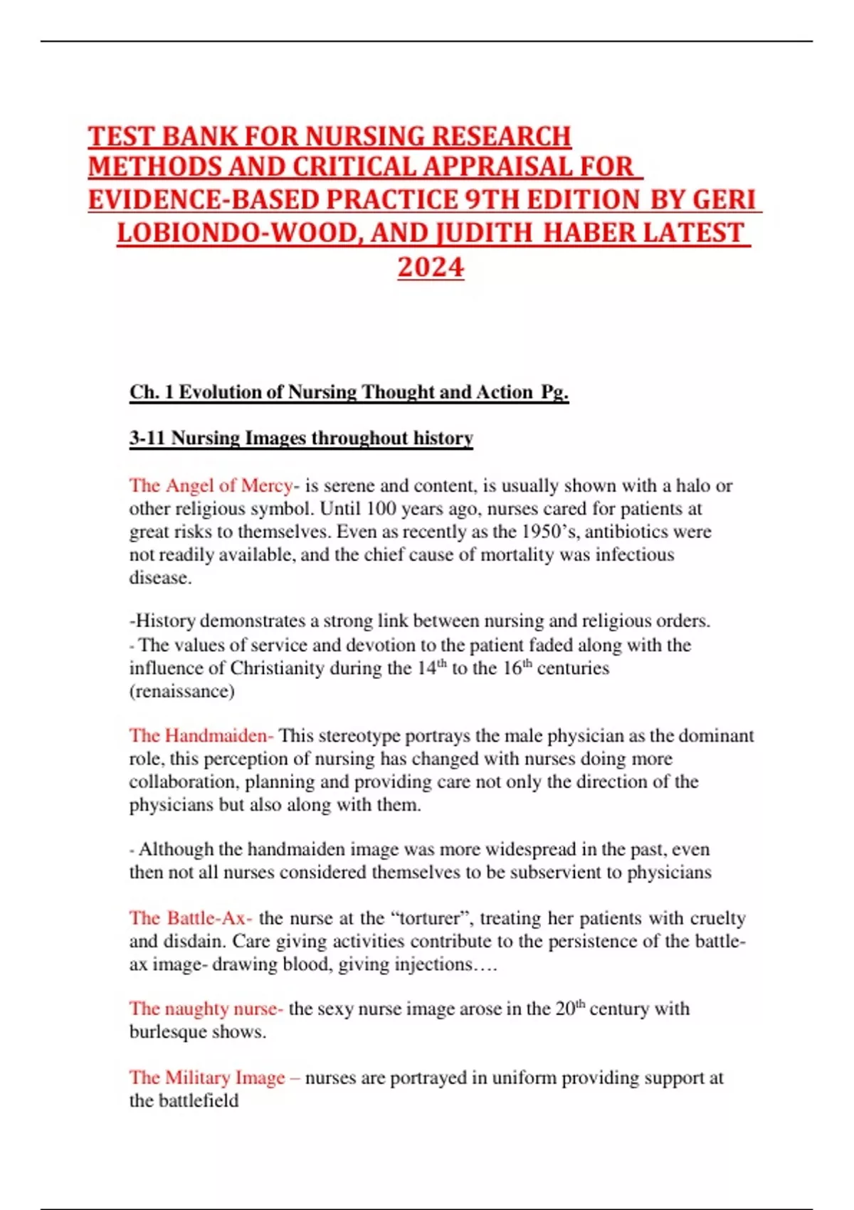 TEST BANK FOR NURSING RESEARCH METHODS AND CRITICAL APPRAISAL FOR EVIDENCE-BASED PRACTICE 9TH EDITION BY GERI LOBIONDO-WOOD, AND JUDITH HABER LATEST 2024 Ch. 1 Evolution of Nursing Thought and Action Pg. 3-11 Nursing Images throughout history The Angel of Mercy- is serene and content, is usually shown with a halo or other religious symbol. Until 100 years ago, nurses cared for patients at great risks to themselves. Even as recently as the 1950’s, antibiotics were not readily available, and the chief cause of mortality was infectious disease. -History demonstrates a strong link between nursing and religious orders. - The values of service and devotion to the patient faded along with the influence of Christianity during the 14th to the 16th centuries (renaissance) The Handmaiden- This stereotype portrays the male physician as the dominant role, this perception of nursing has changed with nurses doing more collaboration, planning and providing care not only the direction of the physicians but also along with them. - Although the handmaiden image was more widespread in the past, even then not all nurses considered themselves to be subservient to physicians The Battle-Ax- the nurse at the “torturer”, treating her patients with cruelty and disdain. Care giving activities contribute to the persistence of the battleax image- drawing blood, giving injections…. The naughty nurse- the sexy nurse image arose in the 20th century with burlesque shows. The Military Image – nurses are portrayed in uniform providing support at the battlefield Hospitalers- specialized soldiers during the crusade who at the end of battle returned to the outposts to care for the sick and injured Describe the role of religion in the development of nursing. In Eygpt, ancient Greece and Rome, temples were health centers as well as places of worship. Nurses started off in monasteries but moved to hospitals due to persecution. Ancient writings describe nursing responsibilities/attributes to include: knowledge of the preparation, compounding, and administration of drugs, wisdom, purity and devotion to the patient