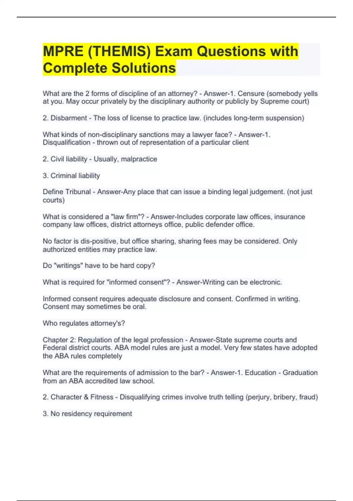 What are the 2 forms of discipline of an attorney? - Answer-1. Censure (somebody yells at you. May occur privately by the disciplinary authority or publicly by Supreme court) 2. Disbarment - The loss of license to practice law. (includes long-term suspension) What kinds of non-disciplinary sanctions may a lawyer face? - Answer-1. Disqualification - thrown out of representation of a particular client 2. Civil liability - Usually, malpractice 3. Criminal liability Define Tribunal - Answer-Any place that can issue a binding legal judgement. (not just courts) What is considered a "law firm"? - Answer-Includes corporate law offices, insurance company law offices, district attorneys office, public defender office. No factor is dis-positive, but office sharing, sharing fees may be considered. Only authorized entities may practice law. Do "writings" have to be hard copy? What is required for "informed consent"? - Answer-Writing can be electronic. Informed consent requires adequate disclosure and consent. Confirmed in writing. Consent may sometimes be oral. Who regulates attorney's? Chapter 2: Regulation of the legal profession - Answer-State supreme courts and Federal district courts. ABA model rules are just a model. Very few states have adopted the ABA rules completely What are the requirements of admission to the bar? - Answer-1. Education - Graduation from an ABA accredited law school. 2. Character & Fitness - Disqualifying crimes involve truth telling (perjury, bribery, fraud) 3. No residency requirement