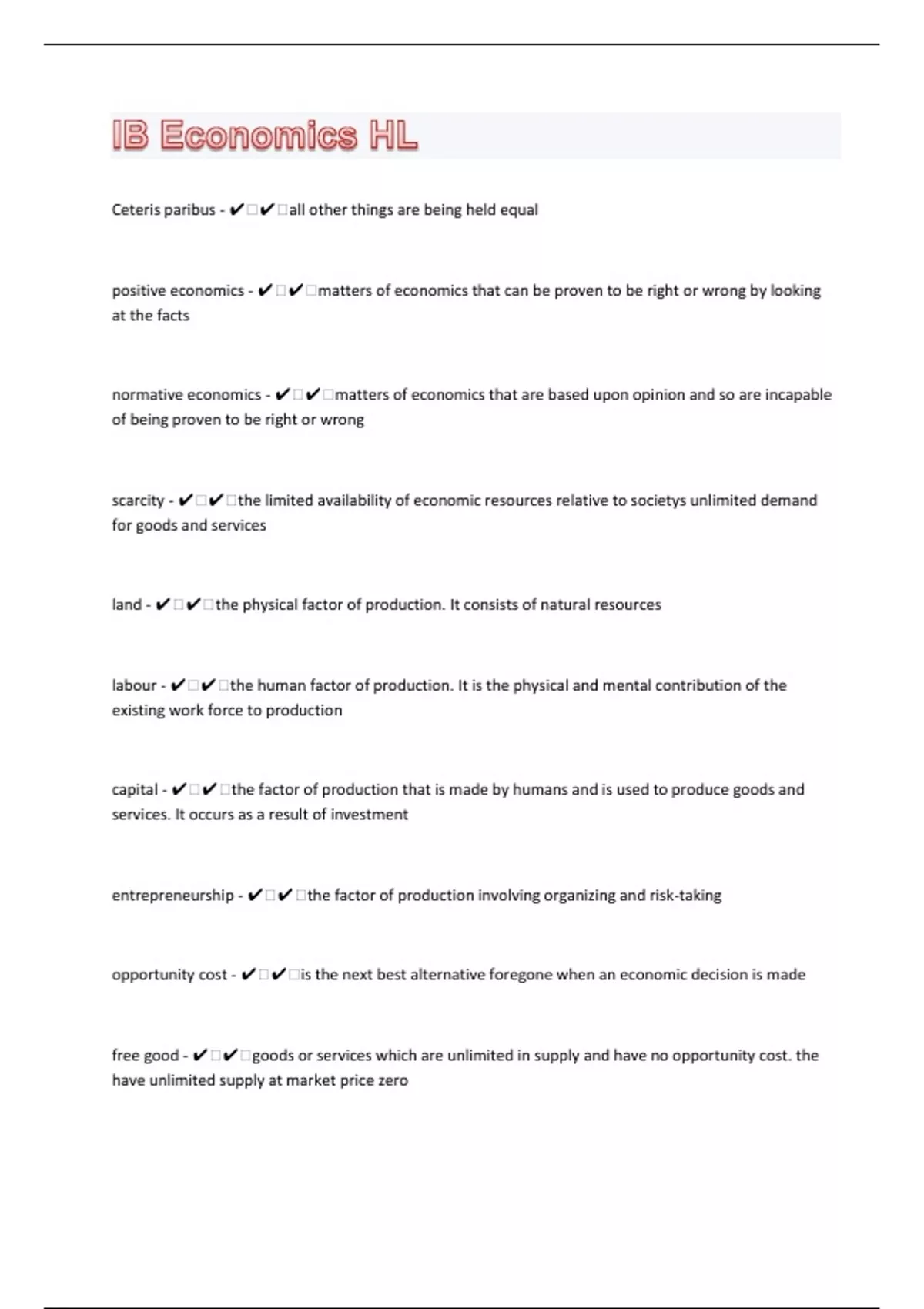 Ceteris paribus - ️️all other things are being held equal positive economics - ️️matters of economics that can be proven to be right or wrong by looking at the facts normative economics - ️️matters of economics that are based upon opinion and so are incapable of being proven to be right or wrong scarcity - ️️the limited availability of economic resources relative to societys unlimited demand for goods and services land - ️️the physical factor of production. It consists of natural resources labour - ️️the human factor of production. It is the physical and mental contribution of the existing work force to production capital - ️️the factor of production that is made by humans and is used to produce goods and services. It occurs as a result of investment entrepreneurship - ️️the factor of production involving organizing and risk-taking opportunity cost - ️️is the next best alternative foregone when an economic decision is made free good - ️️goods or services which are unlimited in supply and have no opportunity cost. the have unlimited supply at market price zero