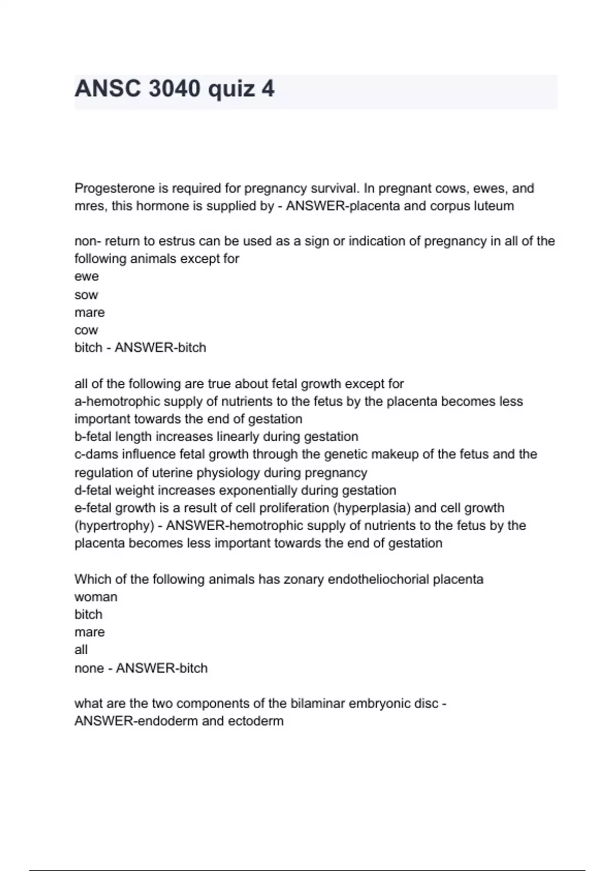 ANSC 3040 quiz 4 Progesterone is required for pregnancy survival. In pregnant cows, ewes, and mres, this hormone is supplied by - ANSWER-placenta and corpus luteum non- return to estrus can be used as a sign or indication of pregnancy in all of the following animals except for ewe sow mare cow bitch - ANSWER-bitch all of the following are true about fetal growth except for a-hemotrophic supply of nutrients to the fetus by the placenta becomes less important towards the end of gestation b-fetal length increases linearly during gestation c-dams influe