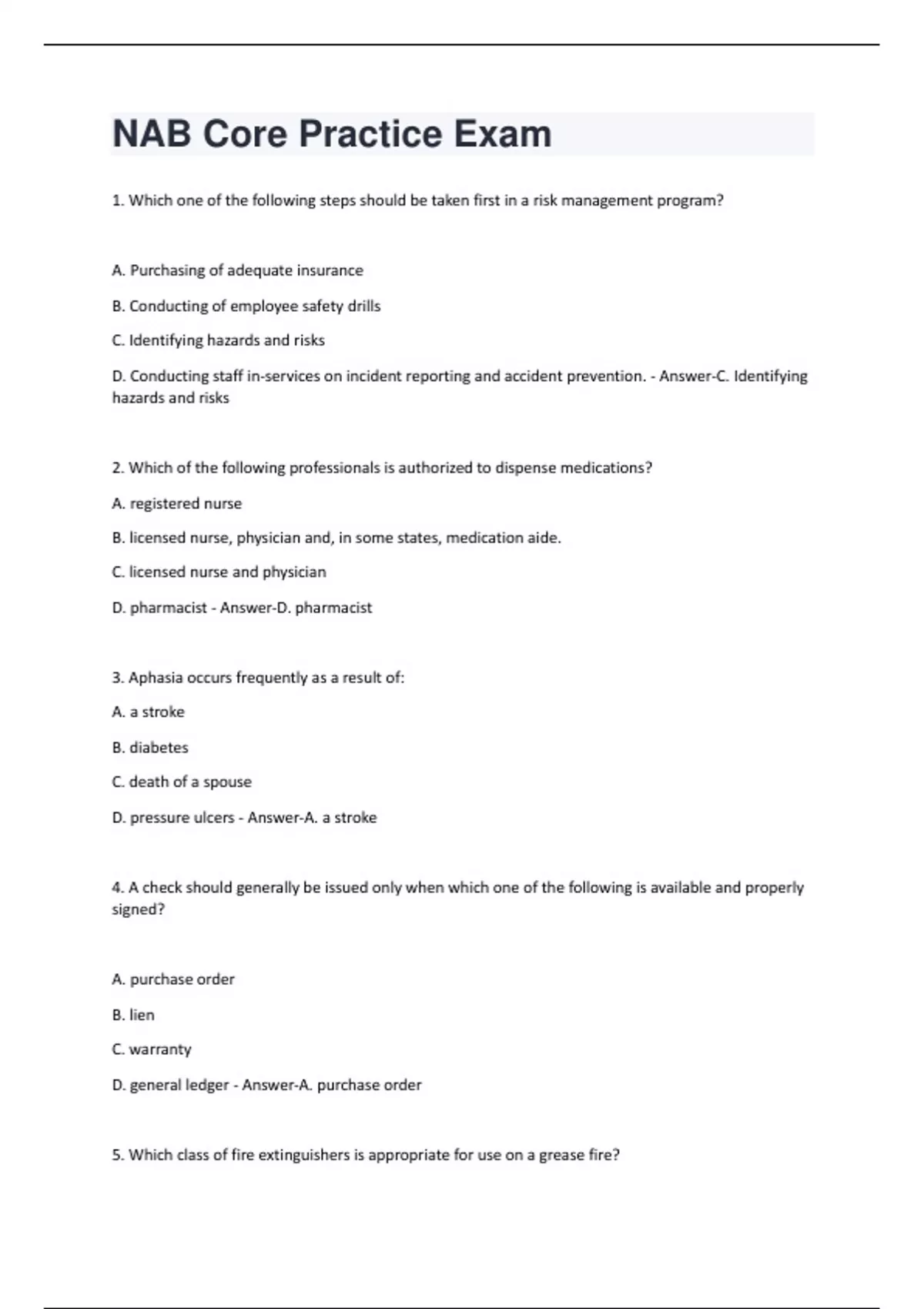 1. Which one of the following steps should be taken first in a risk management program? A. Purchasing of adequate insurance B. Conducting of employee safety drills C. Identifying hazards and risks D. Conducting staff in-services on incident reporting and accident prevention. - Answer-C. Identifying hazards and risks 2. Which of the following professionals is authorized to dispense medications? A. registered nurse B. licensed nurse, physician and, in some states, medication aide. C. licensed nurse and physician D. pharmacist - Answer-D. pharmacist 3. Aphasia occurs frequently as a result of: A. a stroke B. diabetes C. death of a spouse D. pressure ulcers - Answer-A. a stroke 4. A check should generally be issued only when which one of the following is available and properly signed? A. purchase order B. lien C. warranty D. general ledger - Answer-A. purchase order 5. Which class of fire extinguishers is appropriate for use on a grease fire?A. A B. B C. C D. D - Answer-B. B 6. The age-related clouding of the lens of the eye is called: A. macular degeneration B. a cataract C. glaucoma D. conjunctivitis - Answer-B. a cataract