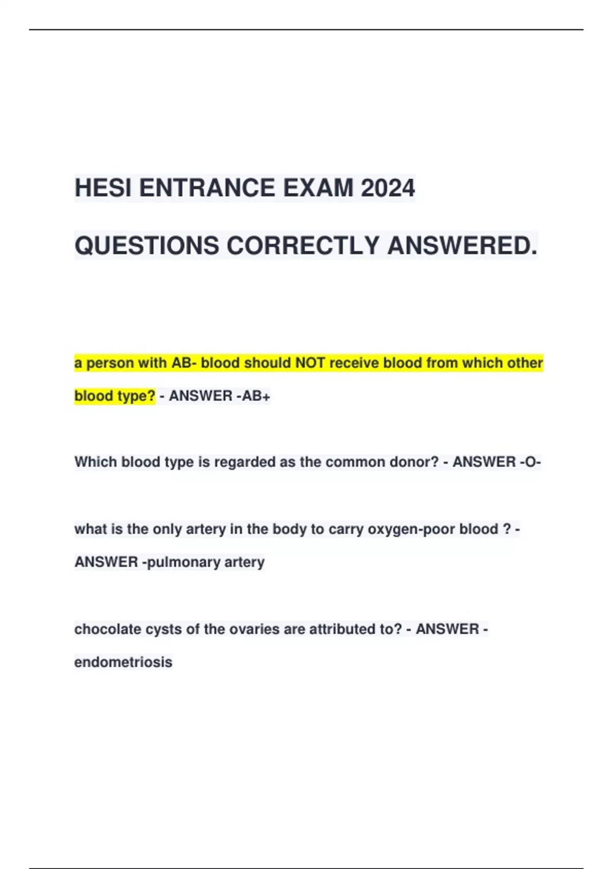 HESI ENTRANCE EXAM 2024 QUESTIONS CORRECTLY ANSWERED. a person with AB - blood should NOT receive blood from which other blood type? - ANSWER -AB+ Which blood type is regarded as the common donor? - ANSWER -O- what is the only artery in the body to carry oxygen -poor blood ? - ANSWER -pulmonary artery chocolate cysts of the ovaries are attributed to? - ANSWER -