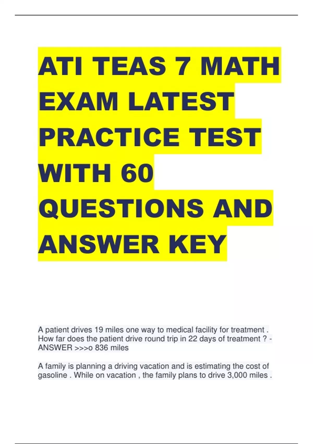 ATI TEAS 7 MATH EXAM LATEST PRACTICE TEST WITH 60 QUESTIONS AND ANSWER KEY