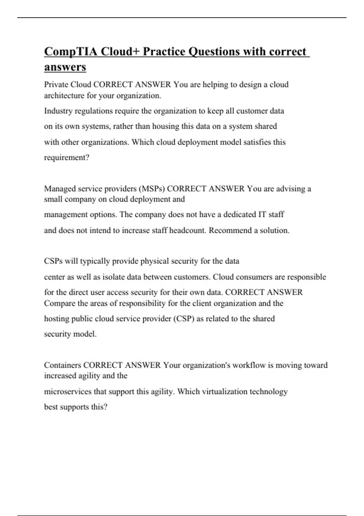 Private Cloud CORRECT ANSWER You are helping to design a cloud architecture for your organization. Industry regulations require the organization to keep all customer data on its own systems, rather than housing this data on a system shared with other organizations. Which cloud deployment model satisfies this requirement? Managed service providers (MSPs) CORRECT ANSWER You are advising a small company on cloud deployment and management options. The company does not have a dedicated IT staff and does not intend to increase staff headcount. Recommend a solution. CSPs will typically provide physical security for the data center as well as isolate data between customers. Cloud consumers are responsible for the direct user access security for their own data. CORRECT ANSWER Compare the areas of responsibility for the client organization and the hosting public cloud service provider (CSP) as related to the shared security model. Containers CORRECT ANSWER Your organization's workflow is moving toward increased agility and the microservices that support this agility. Which virtualization technology best supports this? Automated deployments provide auto scalin