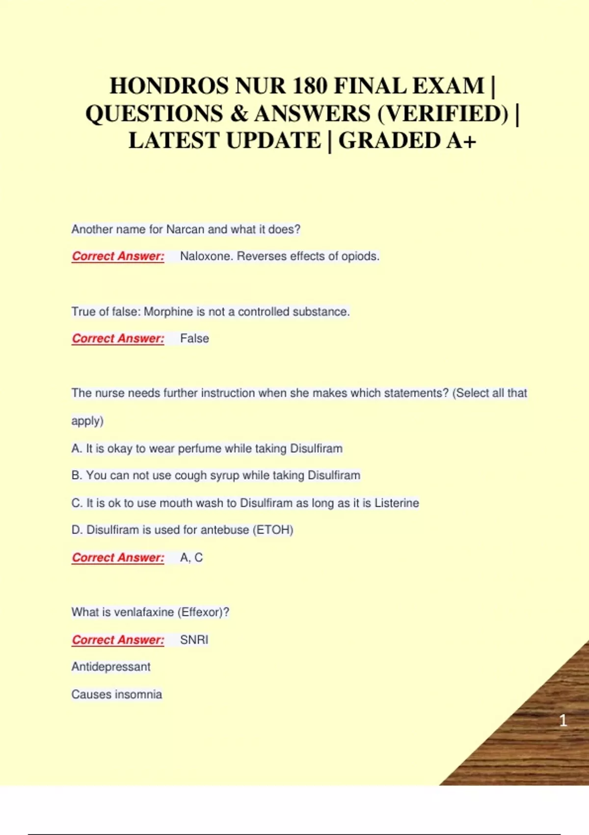 1 HONDROS NUR 180 FINAL EXAM | QUESTIONS & ANSWERS (VERIFIED) | LATEST UPDATE | GRADED A+ Another name for Narcan and what it does? Correct Answer: Naloxone. Reverses effects of opiods. True of false: Morphine is not a controlled substance. Correct Answer: False The nurse needs further instruction when she makes which statements? (Select all that apply) A. It is okay to wear perfume while taking Disulfiram B. You can not use cough syrup while taking Disulfiram C. It is ok to use mouth wash to Disulfiram as long as it is Listerine D. Disulfiram is used for antebuse (ETOH) Correct Answer: A, C What is venlafaxine (Effexor)? Correct Answer: SNRI Antidepressant Causes insomnia 2 What are nursing interventions for Effexor? Correct Answer: Monitor BP/HR Take with food Assess at Lipid panel SNRI is used for? Correct Answer: Dependent Personality Disorder SSRIs are used for? Correct Answer: Bulimia Lams and Pams are? Correct Answer: Benzos What to avoid with MAOIs? Correct Answer: Tyramine foods What to know about Fluoxetine? Correct Answer: SSRI Antidepressant Takes about 4 wks to see results 3 GI bleed caused by ASA Watch for wt changes, dizziness, drowsiness, insomnia, nausea Lithium Carbonate Correct Answer: Watch for use with Lasix Normal range 0.6-1.2 Start to see signs at 1.5 Watch Na Levels Signs of toxicity: vomitting, tremors, lethargy, diarrhea What are antipsychotic drugs? Correct Answer: Haloperidol (Haldol) Quetiapine Olanzopine Fluphenazine Risperidone Prone to EPS What is Cogentin (Benztropine) indicated for? Correct Answer: It's an Antiparkinsonian drug. Used with anti-psychotics to reduce EPS effects. 4 Anticholenergic Diphenhydramine can also be used What to consider when interviewing mental pt? Correct Answer: Provide privacy Delegate Watch nonverbal communication Maslow's-apply to mental pt Correct Answer: Nutrition Safety Warmth Levels of anxiety Correct Answer: 1. Mild (Normal Vs) 2. Moderate (VS slightly elevated; attentive) 3. Severe (Fight or flight) 4. Panic ( low VS, difficulty learning) Make instructions clear and simple 5 Things that prevent coping Correct Answer: Family dynamics Addiction Culture Stress Cognition Primary, Secondary, Tertiary prevention for anxiety Correct Answer: Primary- no stress yet Secondary- Possiblity Tertiary- Already anxious Signs of abuse in Elderly Correct Answer: Poor hygiene Malnutrition Unexplained bruises Sexual sometimes not recognized Signs of Bullying (Victim) Correct Answer: Stomachache HA Low self esteem Suicide 6 Signs of increased Violence Correct Answer: Agitation Anxiety Frustration Survivors of Sucide Victims feel? Correct Answer: Guilt, Anger, Shame What to do for trauma pt? Correct Answer: Stay with them Let them know they're safe Improve cognitive impairment Correct Answer: Carpeted room No flickering lights Dim lights White noise Treat with calendars, large clocks and daily routine What is spiritual care? Correct Answer: Inner strength 7 Self awareness Meaning of life Relationships Collecting data for spiritual care Correct Answer: Role of religion Source of strength Do they pray? Any special holidays? What is sprititual distress? Correct Answer: Questioning your faith Religious accessories? Correct Answer: Check with surgery Questions for anorexia nervosa pt Correct Answer: How do you feel about your appearance? What do you know about hypokalemia? Characteristics of Anorexia Nervosa pt Correct Answer: Hyperactive Introverted 8 Rapid speech, walk, talk Perfectionist Denies hunger What do you need to know about refeeding syndrome? Correct Answer: Assess VS Caused by high carb diet What are precautions for ECT (Shock therapy) Correct Answer: Need a ride home NPO due to general anesthesia 1 min seizure Monitor VS Won't get if you have increased ICP Side Effects are confusion, short term memory loss, HA Depression Correct Answer: Social isolation Apathy Anhedonia (no pleasure) Negative feelings Suicide Ideation questions 9 Correct Answer: How would you do it? Are you sleeping? Any previous manic/ depressive episodes? Suicidal thoughts? Treatment for depressive disorder Correct Answer: Cognitive behavioral therapy Interventions with substance related issues Correct Answer: Educate Encourage here and now Encourage problem solving Alcohol withdrawal Correct Answer: Feel is 6-9 hrs after last drink Will have course tremors, irritability, anxiety Psychosis Correct Answer: Disorganized thinking Delusions Hallucinations What are the voices telling you? Say "I don't hear the voices but I see they frighten you. You are safe." 10 positive symptoms of schizophrenia Correct Answer: delusions and hallucinations negative signs of schizophrenia Correct Answer: avolition - lack of drive. alogia - lack of speech. anhedonia - inability to experience pleasure. flat affect - no signs of normal emotion. ambivalence - contradictory attitudes or feelings. all difficult to treat Cluster A personality disorders Correct Answer: paranoid, schizoid, schizotypal Cluster B personality disorders Correct Answer: antisocial, borderline, narcissistic Cluster C personality disorders Correct Answer: avoidant, dependent, obsessive-compulsive OCD treatment Correct Answer: desensitization, set limits for them Phobia treatment Correct Answer: Flooding 11 extrapyramidal symptoms Correct Answer: side effects of antipsychotic medications that affect a person's gait, movement, or posture